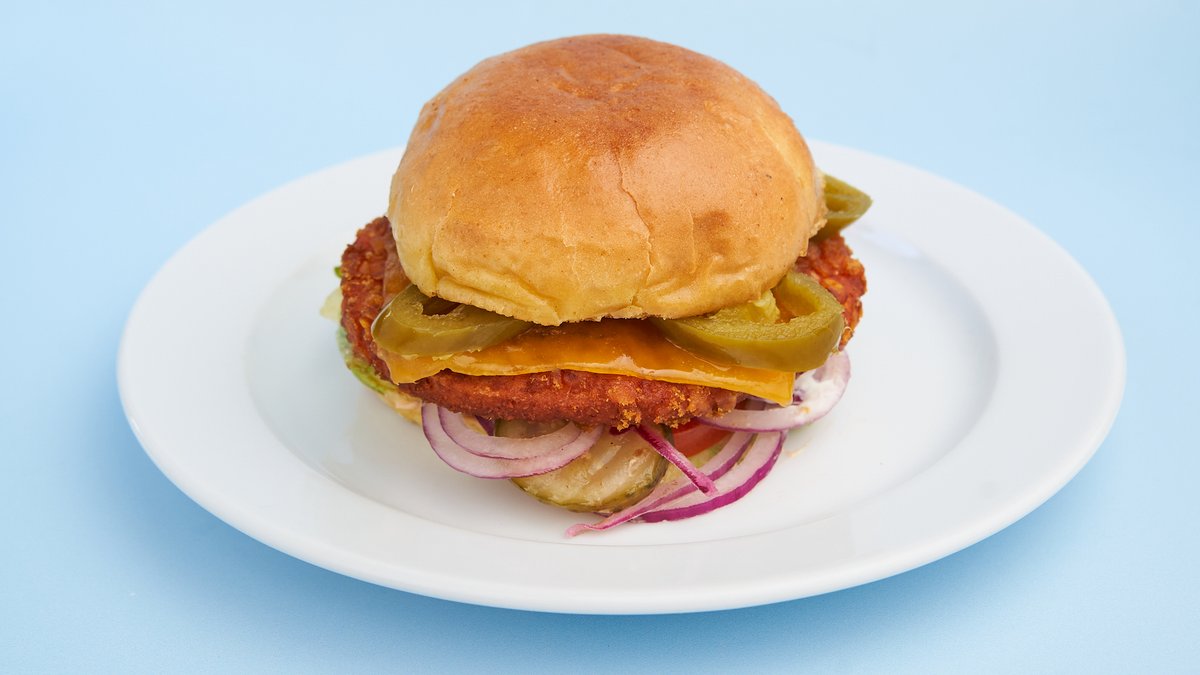 Crunchy Chicken Patty, Potato Buns, Eisbergsalat, Tomate, rote Zwiebeln, Dillgurken und Hut-Soße