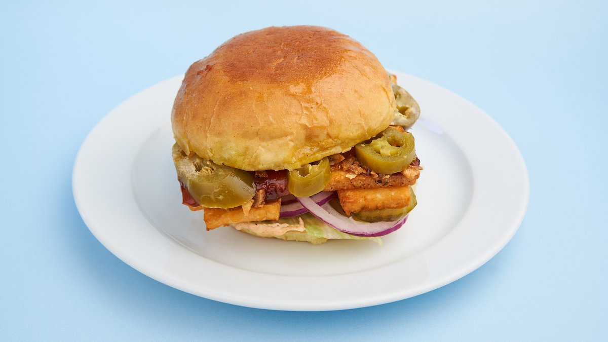 mit Halloumi-Patty, Barbecuesoße, Röstzwiebeln, Cheddar und Jalapeños