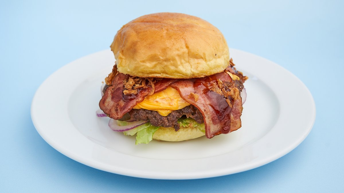 mit 1x Smash-Rindfleischpatty, 2x Scheiben Cheddar-Schmelzkäse, Röstzwiebeln, Speck vom Putenfleisch und Barbecuesoße