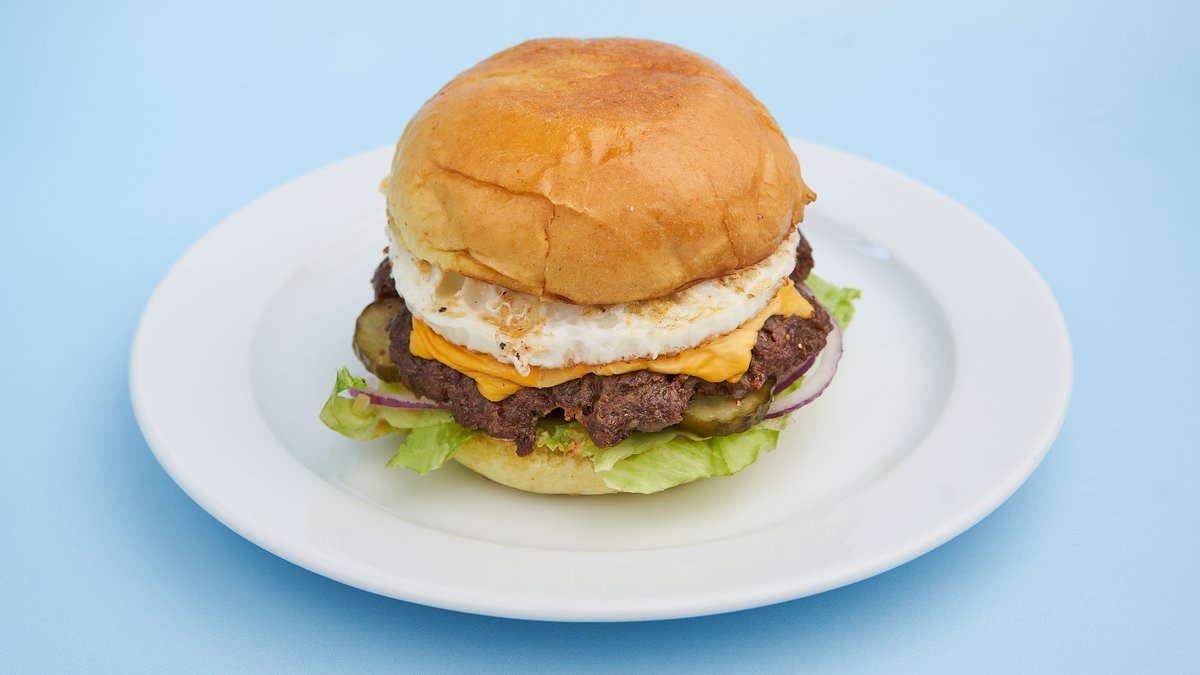 mit 2x Smash-Rindfleischpatties, Spiegelei, BBQ Rind und scharfem Cheddar-Soße