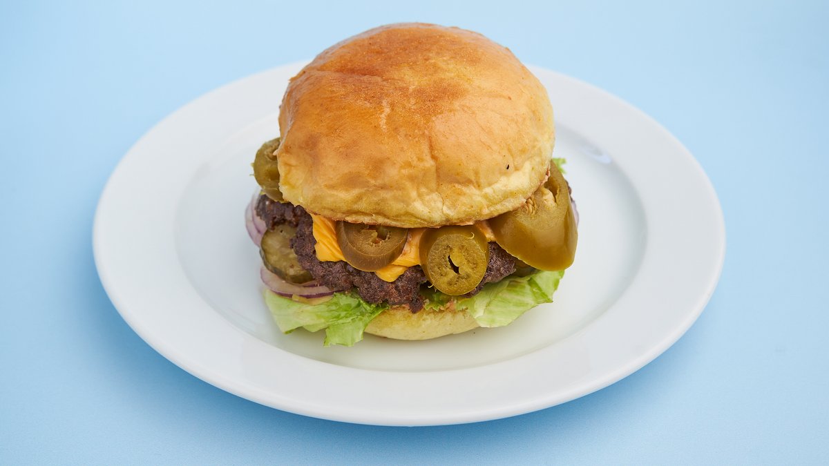 mit 1x Smash-Rindfleischpatty, 2x Scheiben Cheddar-Schmelzkäse, Jalapeños und Chilisoße