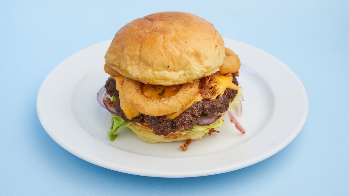 mit 1x Smash-Rindfleischpatty, 1x Scheibe Cheddar-Schmelzkäse, Onion Rings, Barbecuesoße und Röstzwiebeln