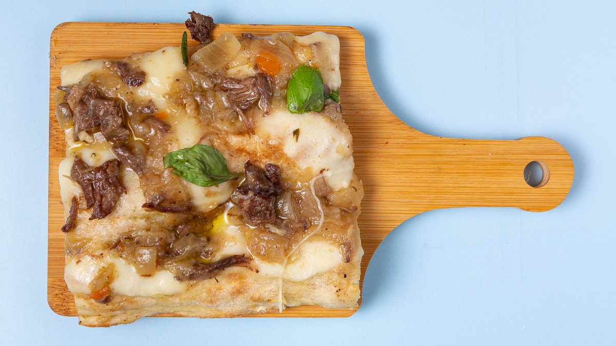 mit weißem Genueser Ragù aus Rindfleisch mit Sellerie, Zwiebeln, Karotten, Rosmarin und geräuchertem Mozzarella