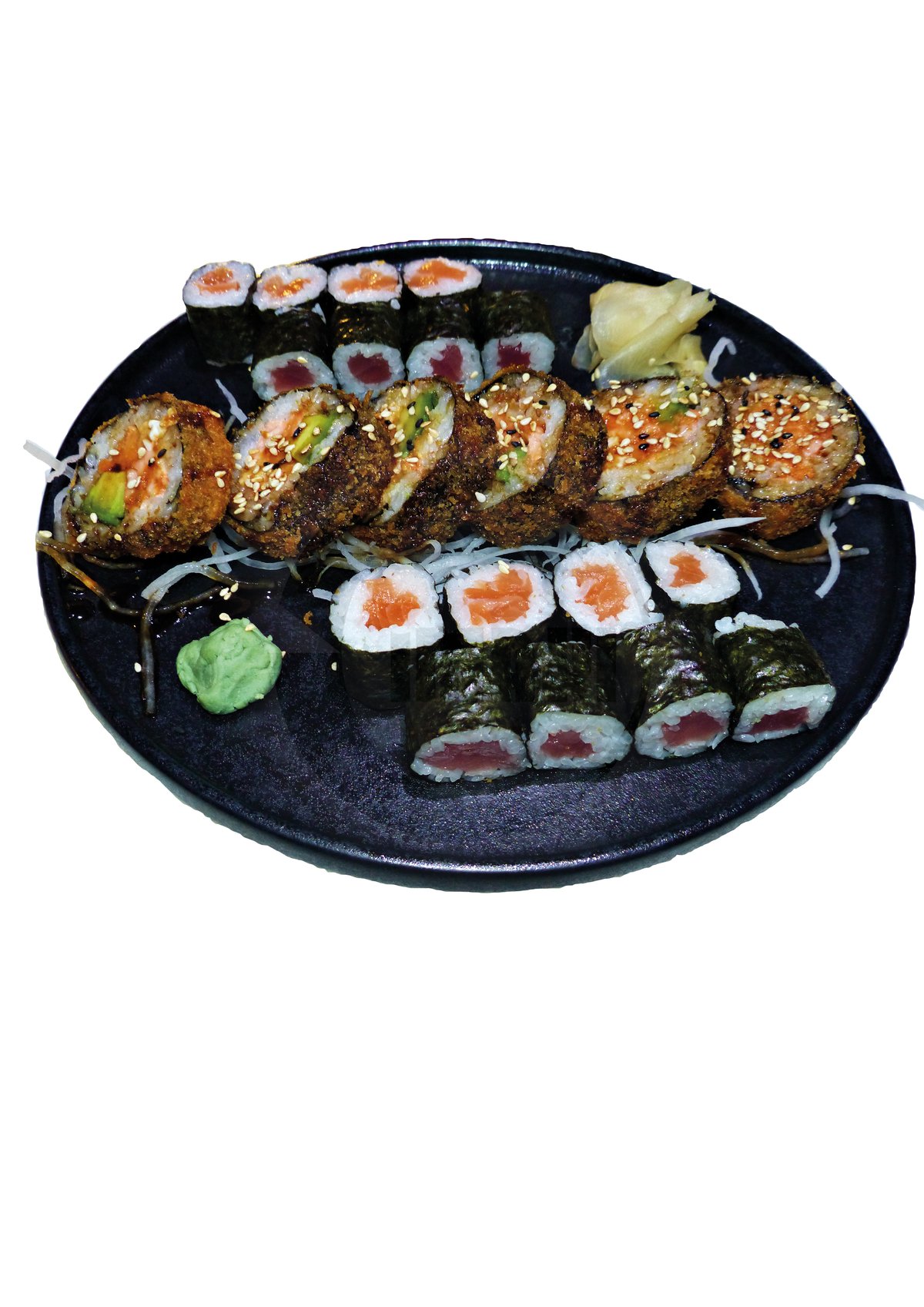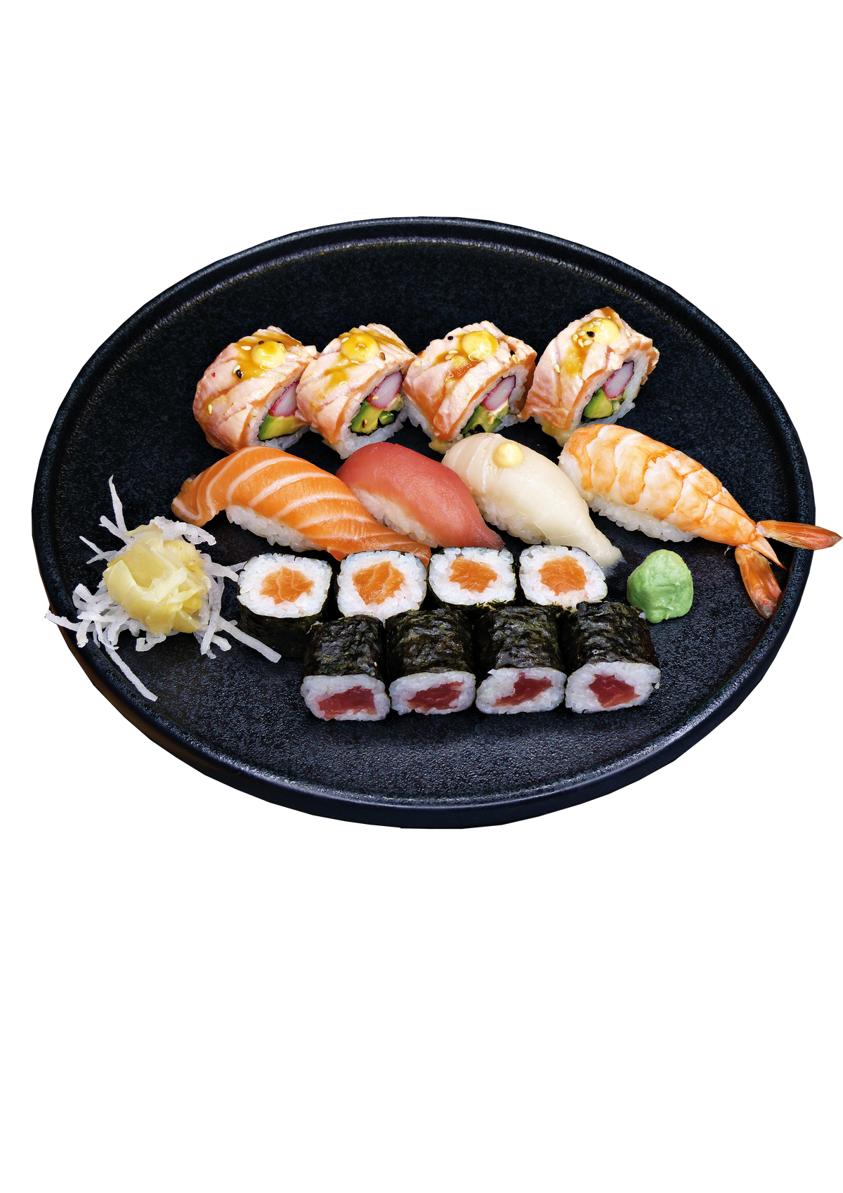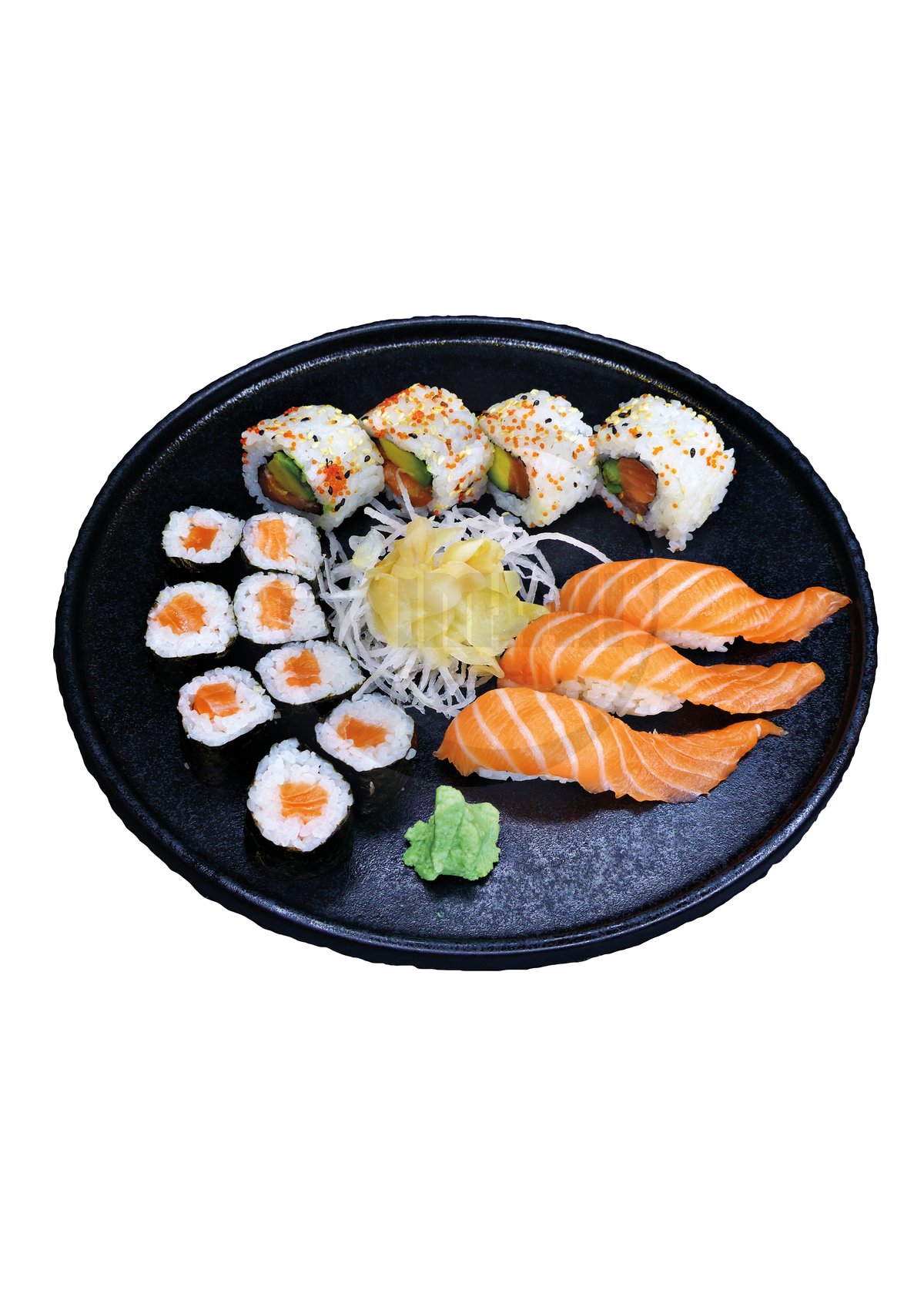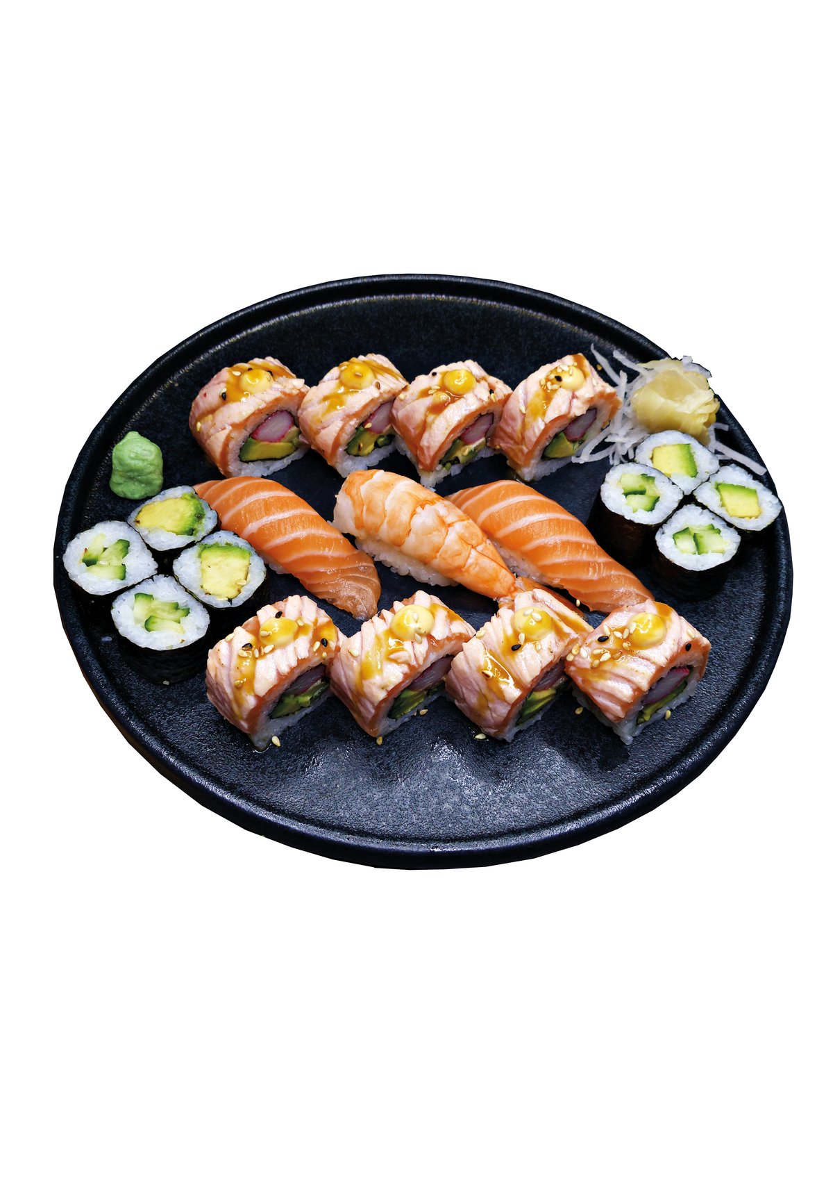16 Maki (Sake, Gurke, Avocado), 6 Sake Futomaki, 5 Nigiri Sake