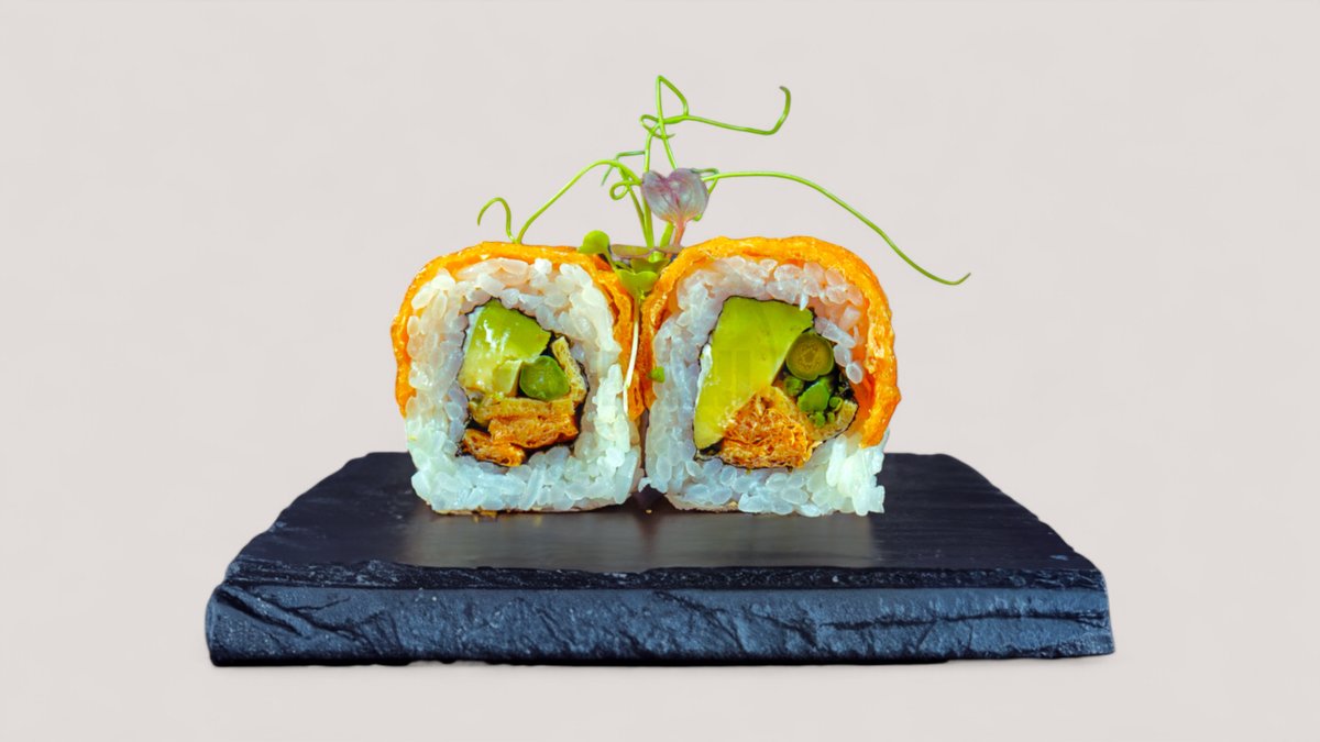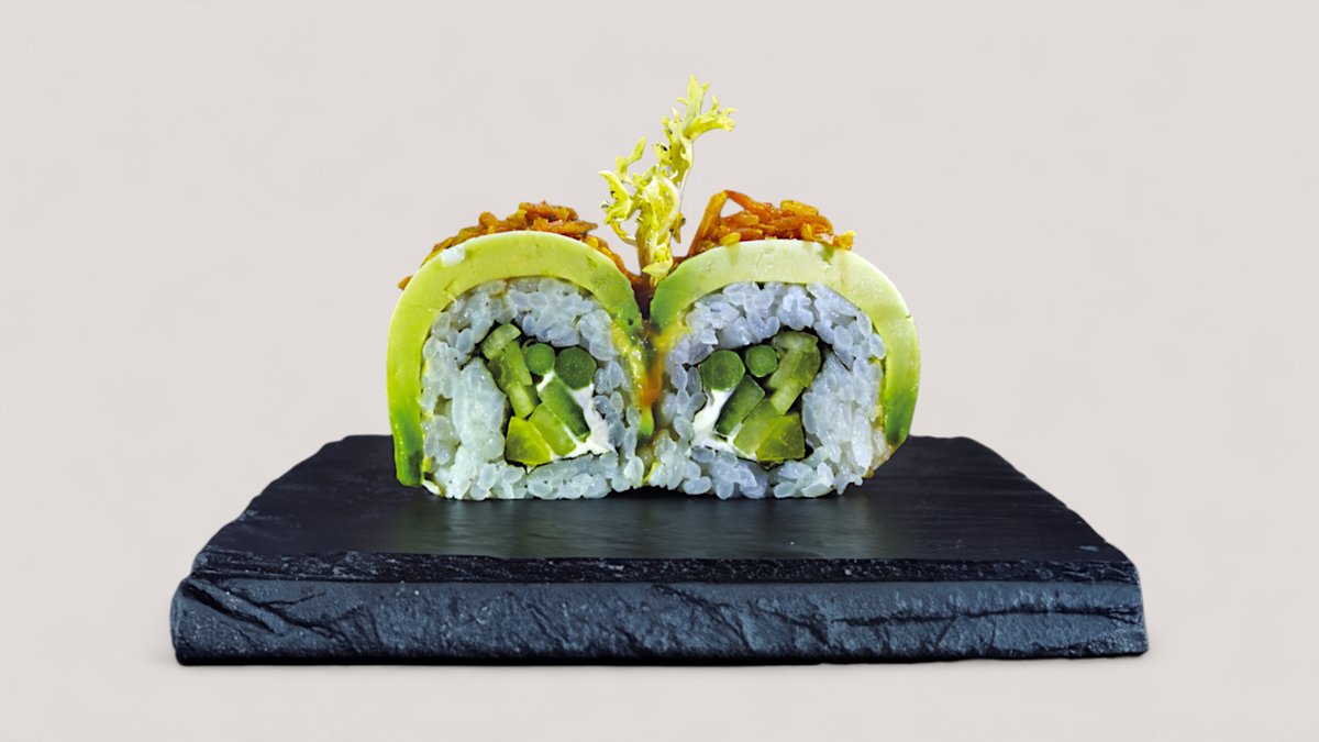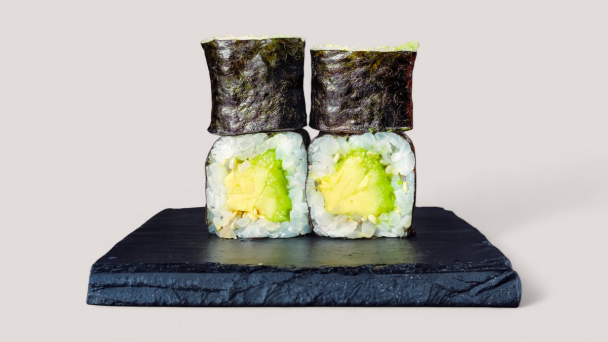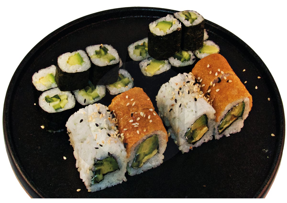8 Avocado Uramaki, 8 Maki gemischt, 2 Nigiri (1 Tofutasche, 1 Avocado), 3 Futomaki Vegetarisch
