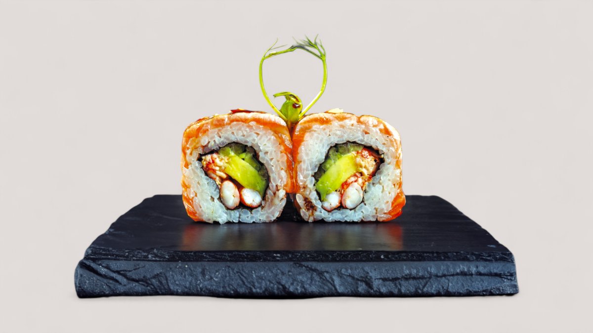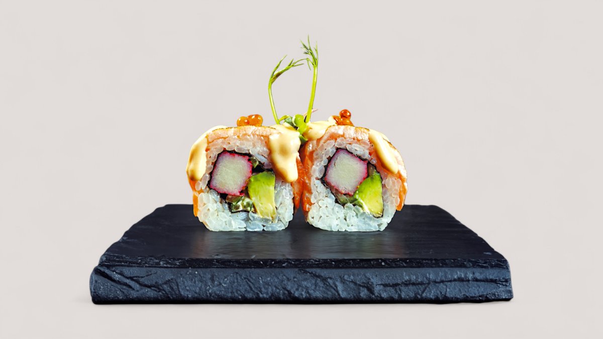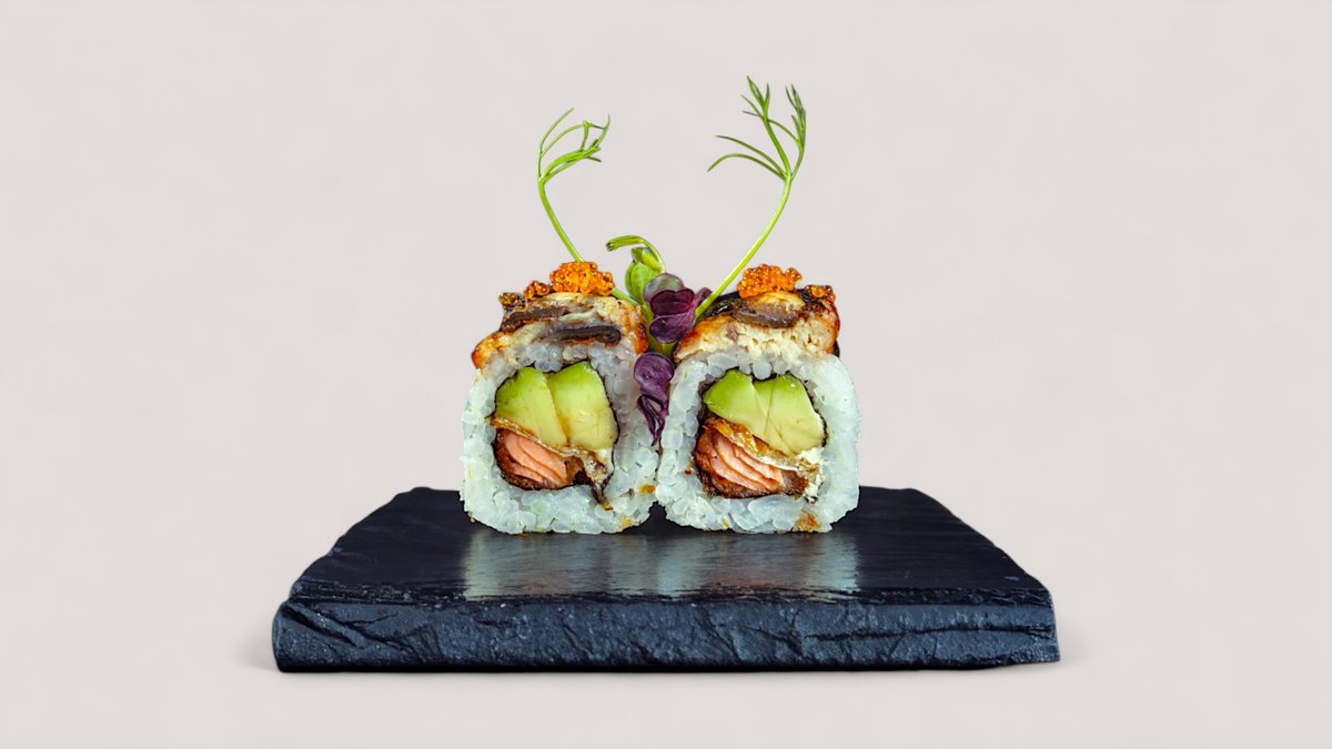 4 Stück mitLachshaut gegrillt, Avocado, Aal gegrillt, Frischkäse und IMAKI Sauce