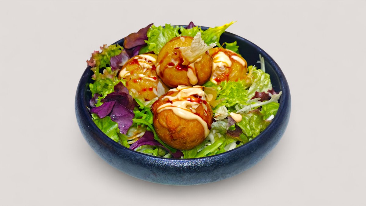 gebratene Oktopusbällchen mit süßer Sojasoße, Mayonnaise und Bonitoflocken