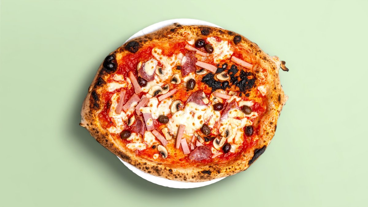 mit Mozzarella Fior di Latte, Napoli Salami, Kochschinken, Champignons, Oliven, frischem Basilikum und Olivenöl extra Vergine