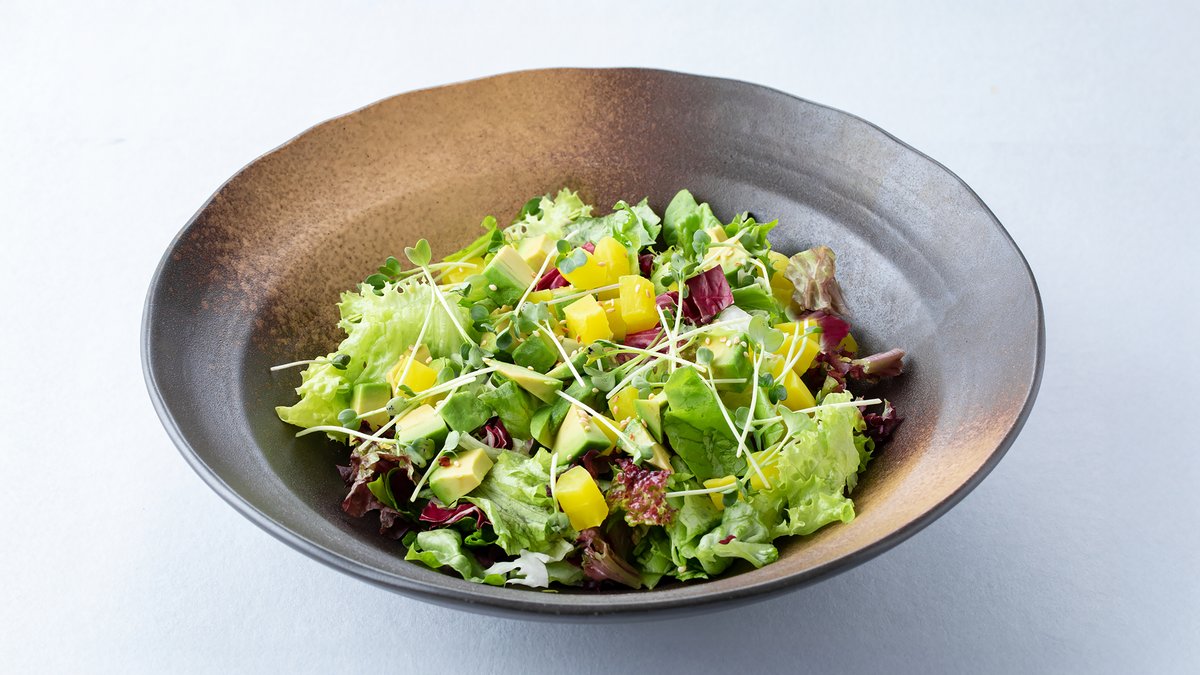 großer Teller frischer Salat mit Avocado, Shinko und Sesam dazu Dressing nach Wahl