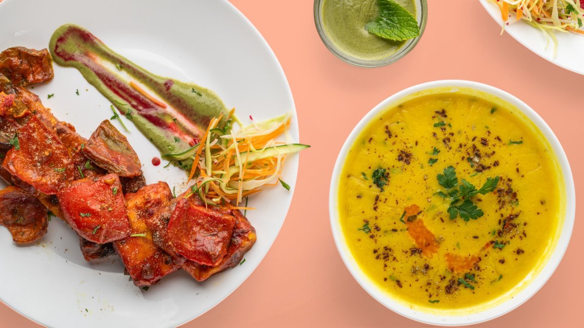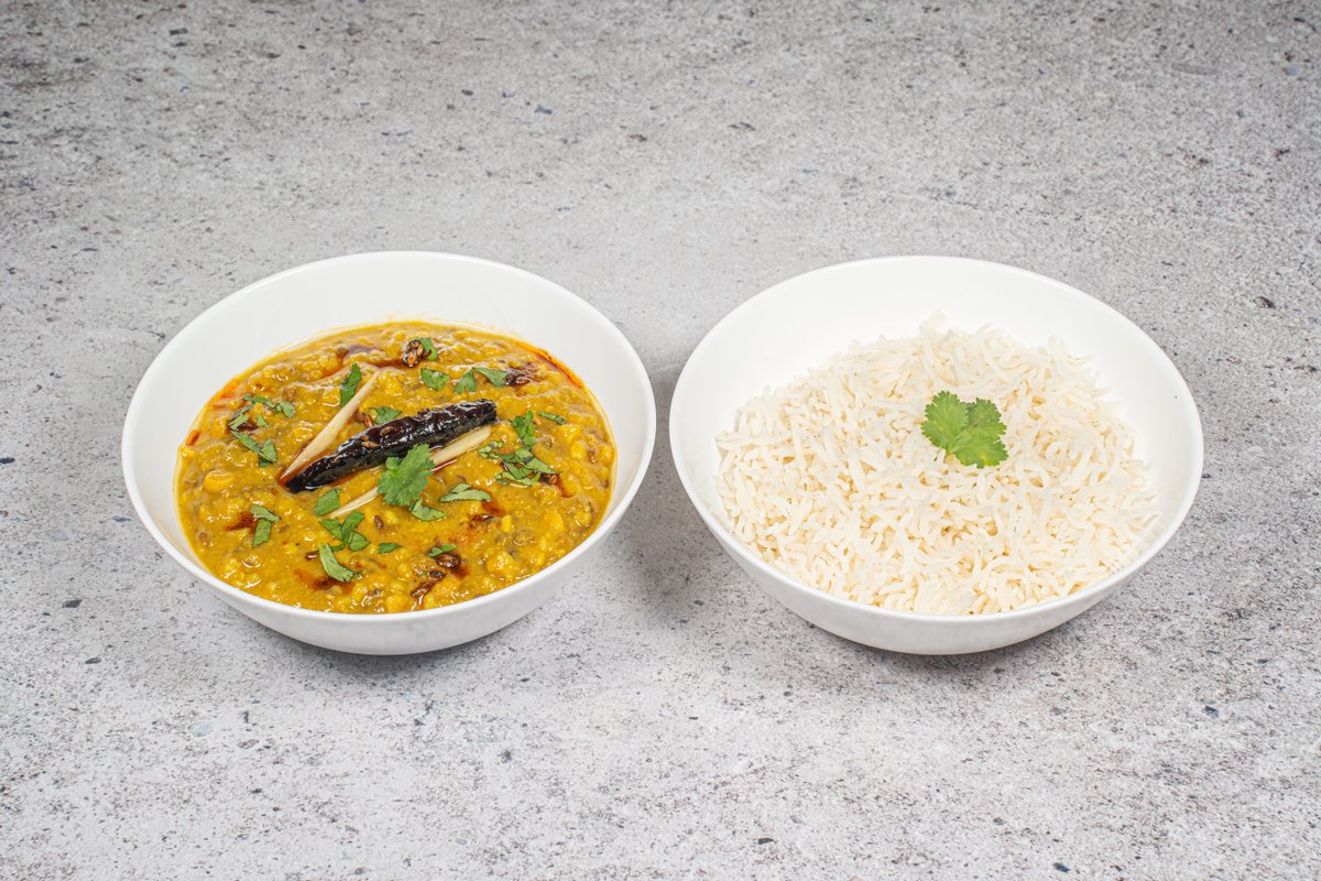 traditionelles Panchmel Dal aus Rajasthan ist eine gesunde Mischung aus fünf verschiedenen Linsensorten: grüne Mungbohnen, gelbe Mungbohnen, Mungbohnen, Chana und Masoor. Es wird mit einer speziellen Mischung indischer Gewürze und einer Prise frischem Koriander gewürzt und mit dampfend gekochtem Reis serviert.