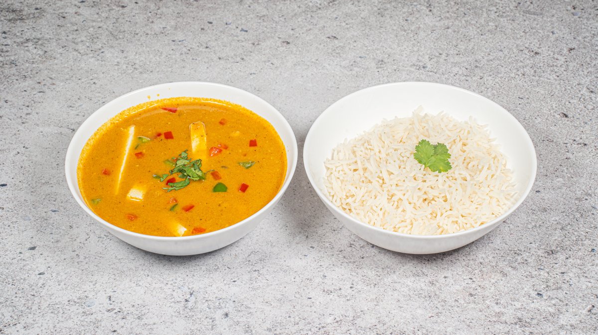 Indischer Käse mit Zwiebeln, Paprika, Ingwer, Tomaten, Joghurt, gewürzt mit indischen Gewürzen und frischem Koriander; mit Reis