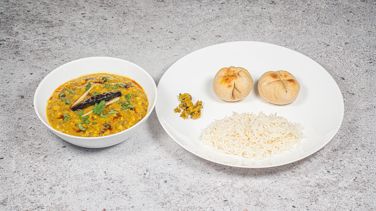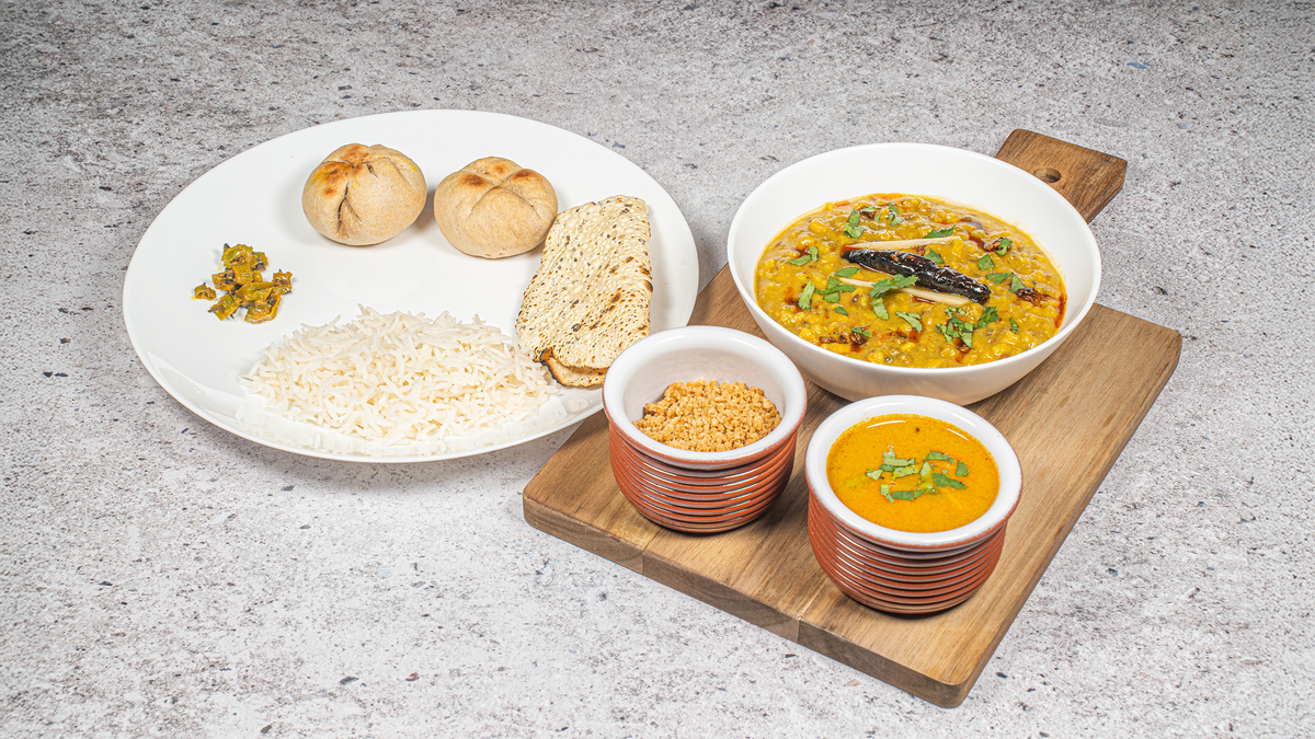 Panchmel Dal, eine nahrhafte Mischung aus fünf Linsensorten – grünen Mungbohnen, gelben Mungbohnen, Urdbohnen, Kichererbsen und roten Linsen – ist ein Grundnahrungsmittel in Rajasthan. Genießen Sie es mit Vollkorn-Bati und Masala-Bati, optional mit etwas Ghee beträufelt. Diese proteinreiche Kombination ist in ganz Indien beliebt und ergibt eine köstliche und sättigende Mahlzeit. Probieren Sie es selbst und entdecken Sie, warum es so viele begeistert. (Nur wenig Reis als Beilage)