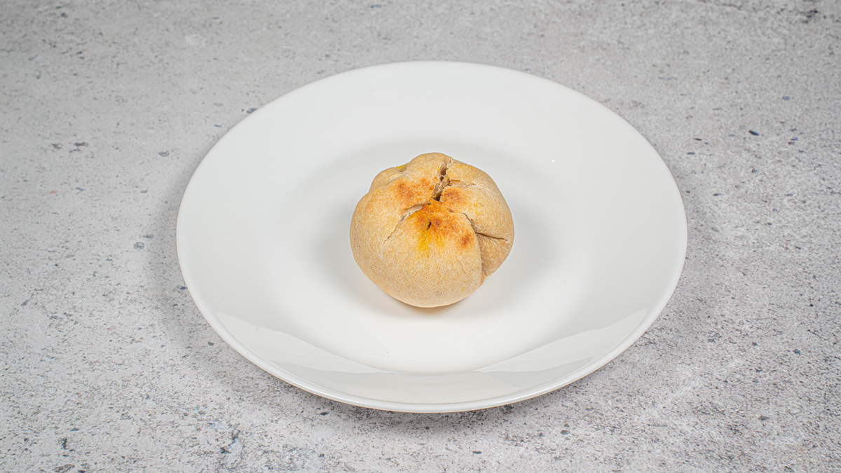 traditionelles Brot nach Rajasthan-Art, zubereitet aus Vollkornmehl; gefüllt mit Kartoffeln, Erbsen und gemischt mit indischen Gewürzen (Masala)