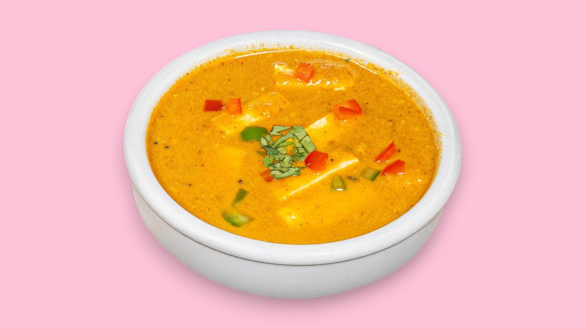 Indischer Käse mit Zwiebeln, Paprika, Ingwer, Tomaten, Joghurt, gewürzt mit indischen Gewürzen und frischem Koriander; Wird ohne Reis als leckere Beilage zum gewählten Hauptgericht serviert.