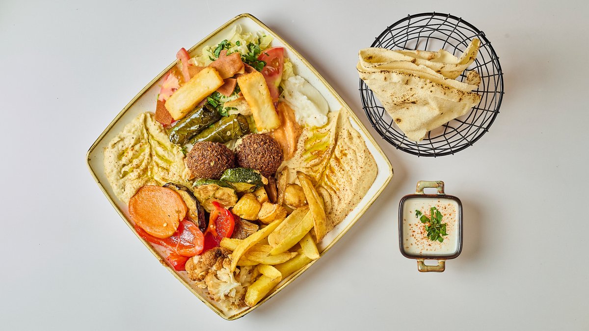 mit Hähnchen-Schawarma, verschiedenen Gemüsesorten, Falafel, Halloumi, gefüllten Weinblättern, Sesam, Knoblauch und hausgemachter Spezialsoße