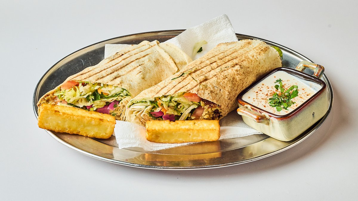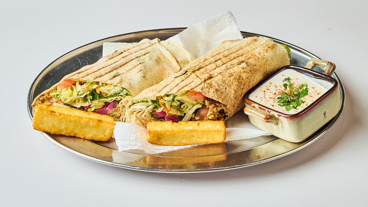 mit frittiertem Käse im Fladenbrot, Hummus und Sesamsoße