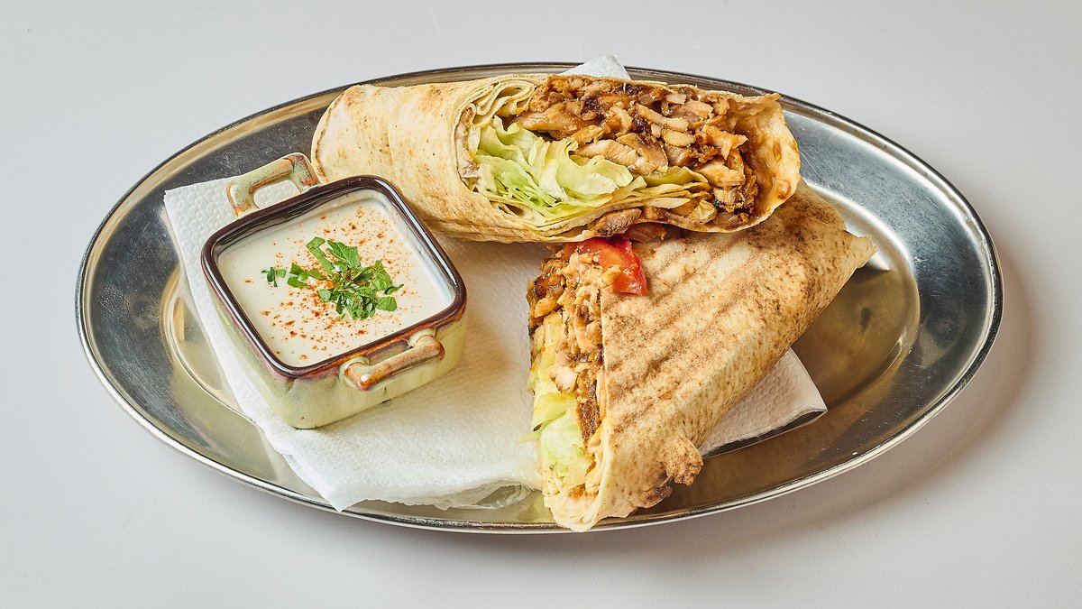 gerolltes Fladenbrot mit Hähnchenfleisch und hausgemachter Spezialsoße