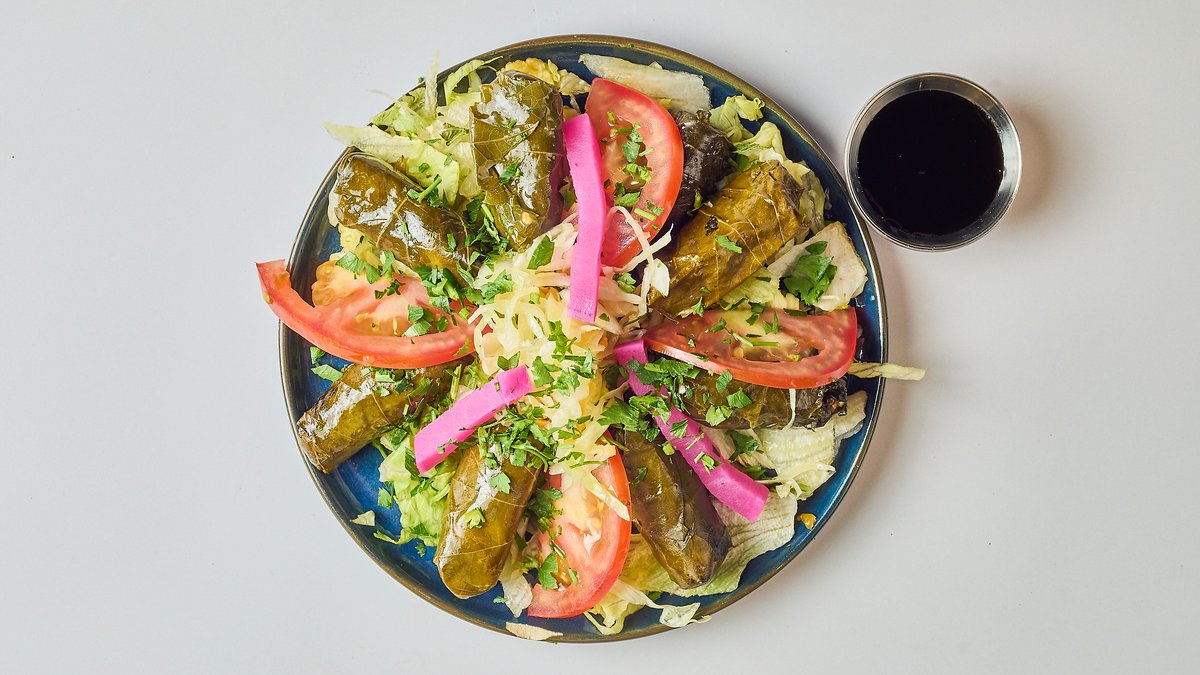 mit verschiedenen Gemüsesorten, Falafel, gefüllten Weinblättern und Sesamsoße