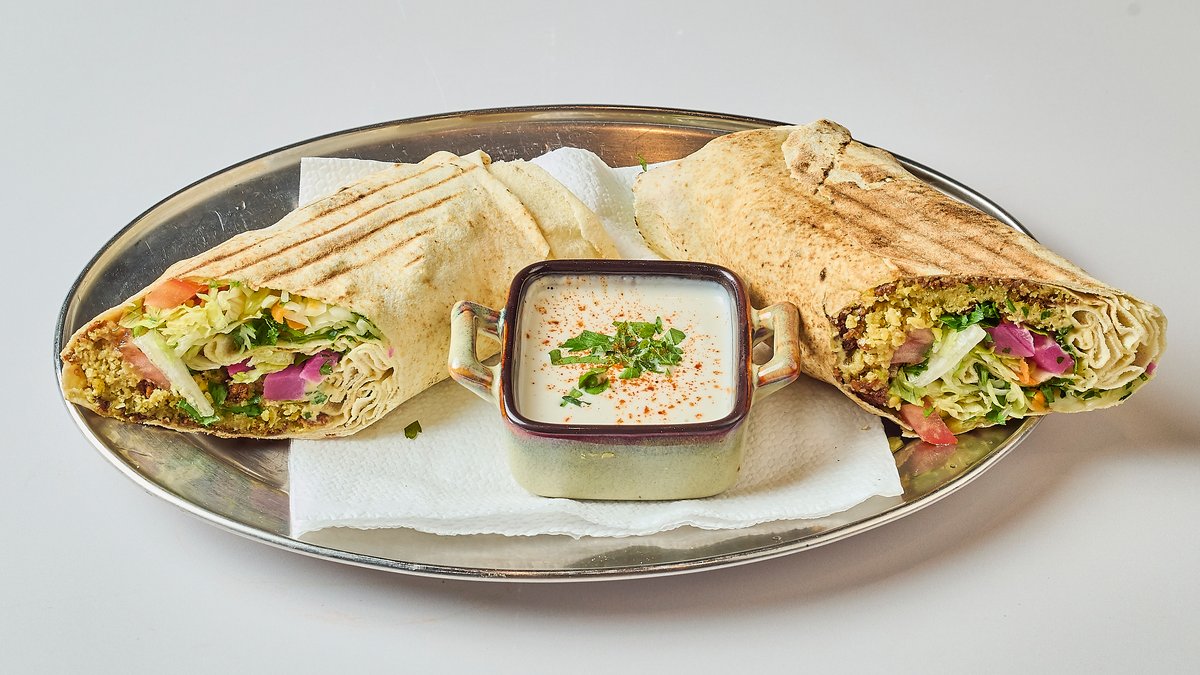 mit Kichererbsen-Bällchen und Sesamsoße im Fladenbrot
