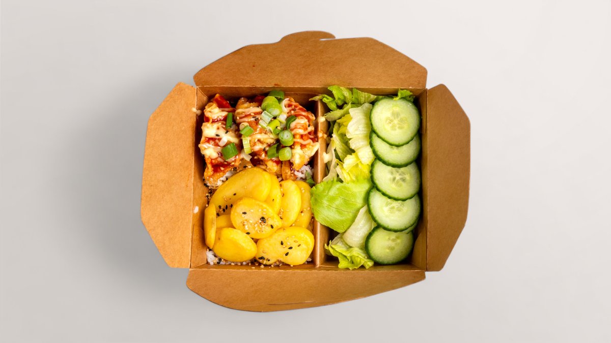 Knusprige Chicken Nuggets auf Reis mit unserer JMT-Sauce, Kimchi Slaw, frischem Salat und Gurken. Getoppt mit Mayo, Sesam und Lauchzwiebeln