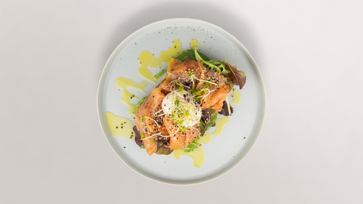 Sauerteigbrot mit Lachs, pochierten Eiern und Frischkäse