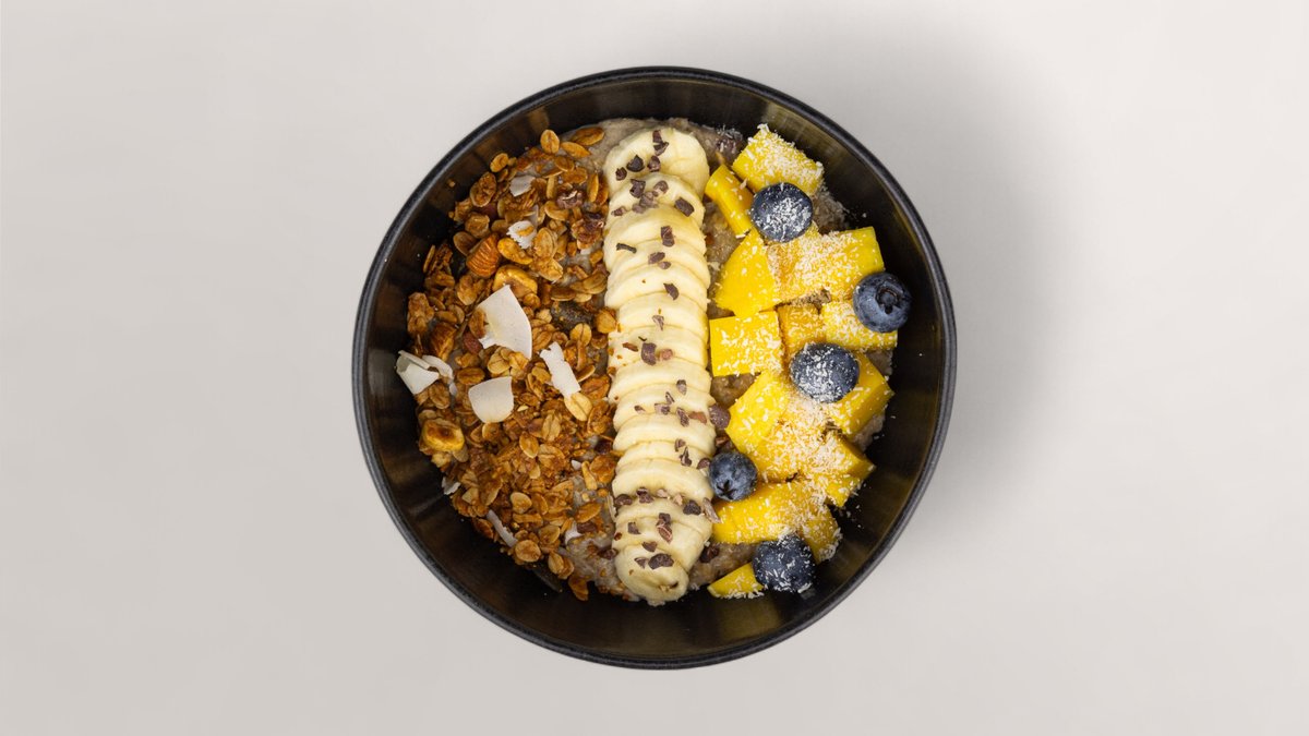 cremiger Porridge gekrönt mit frischen Beeren, Bananenscheiben, Mango und knusprigem, hausgemachtem Granola