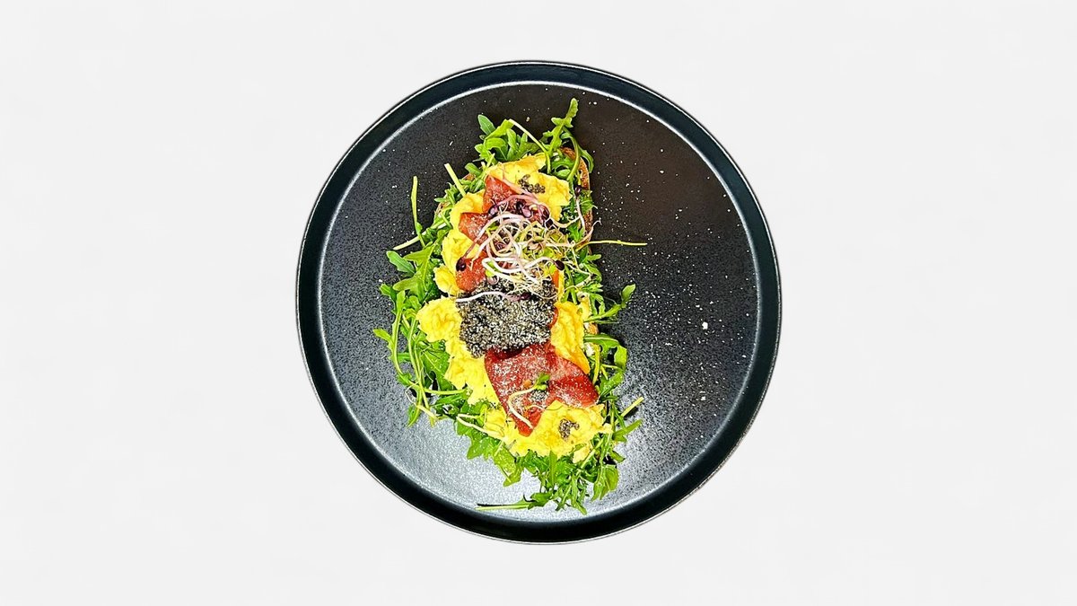 Tartufata (pilz-trüffel-aufstrich), Rucola, Ricotta, Bresaola, Rührei (2 Eier) und Trüffelöl auf Sauerteigbrot