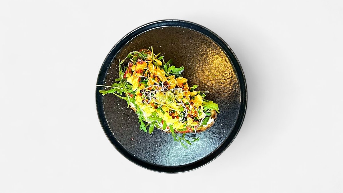 Homemade Crispy Chili Sauce, Ricotta, Rucola, Parmigiano, Tomaten, Rührei (2 Eier) auf Sauerteigbrot