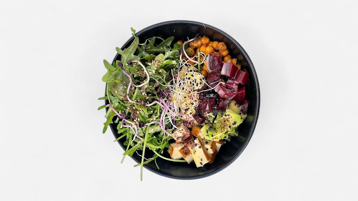 Quinoa, Hummus, Tofu, geröstete Kichererbsen, Avocado, Rote Beete, Rucola und Tahini-Dressing