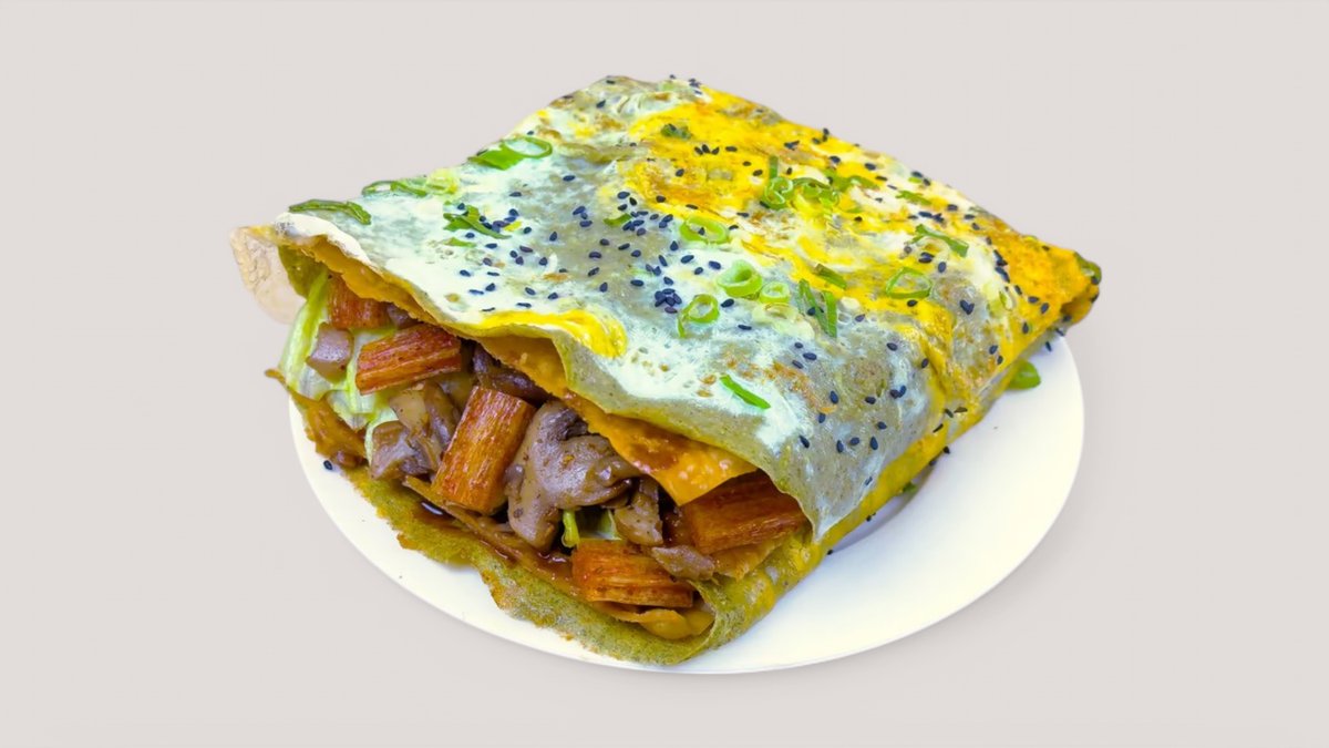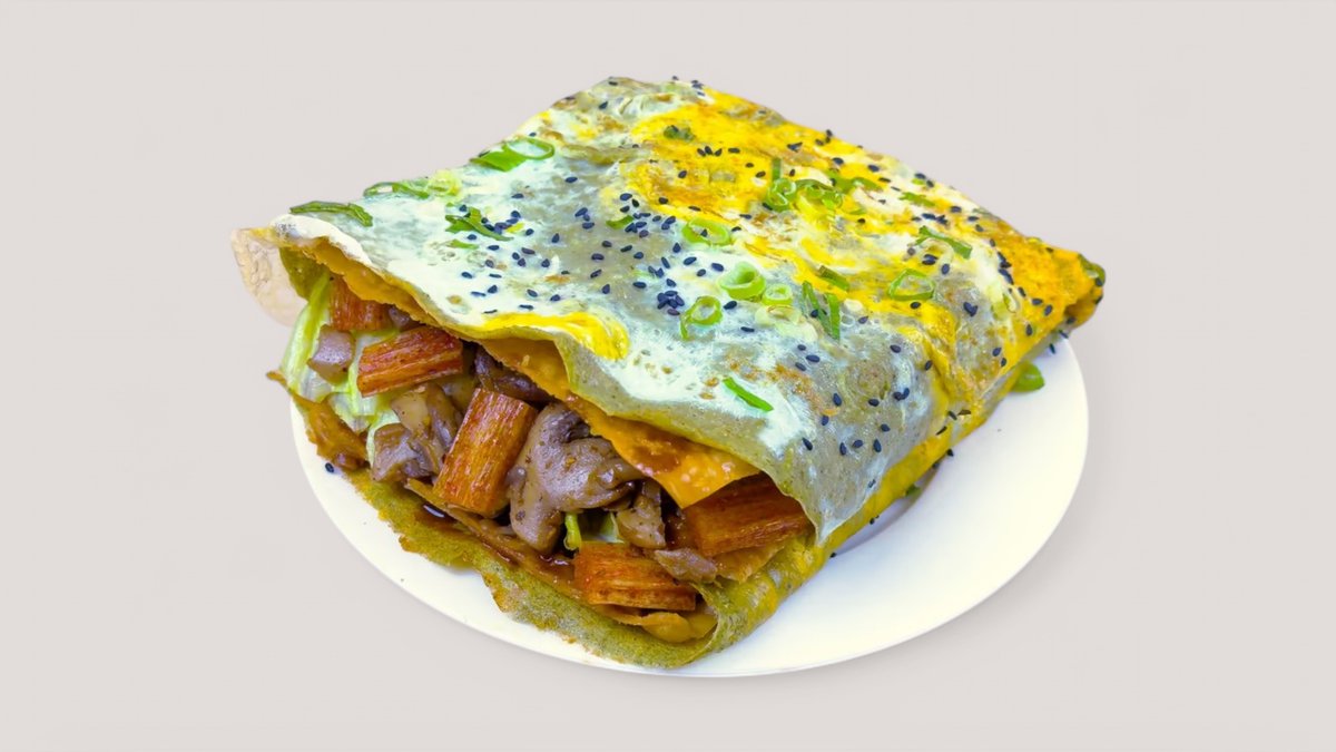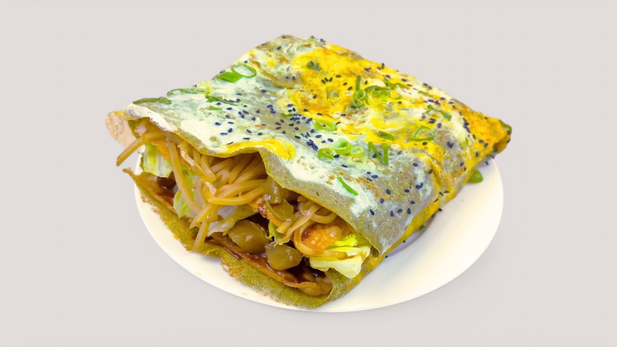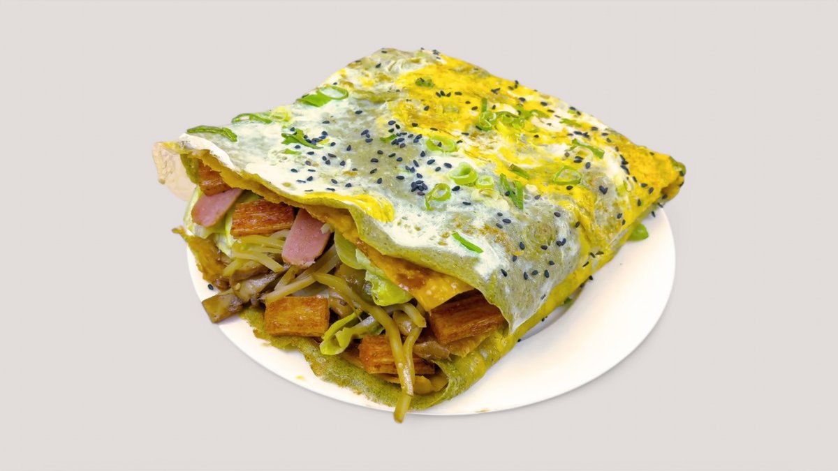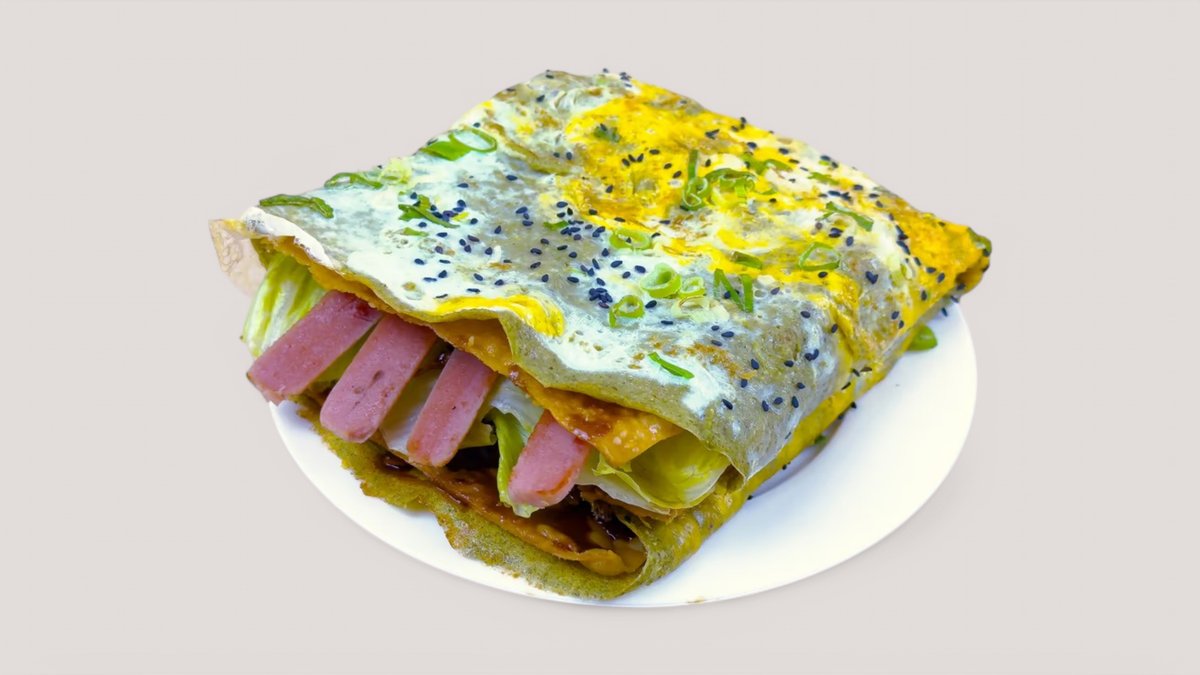 mit 2x Eiern, 1x chinesischer Schweinswurst, 1x Scheibe Schinken vom Schwein und Salat