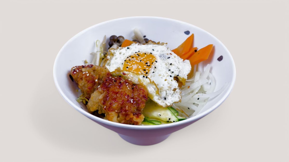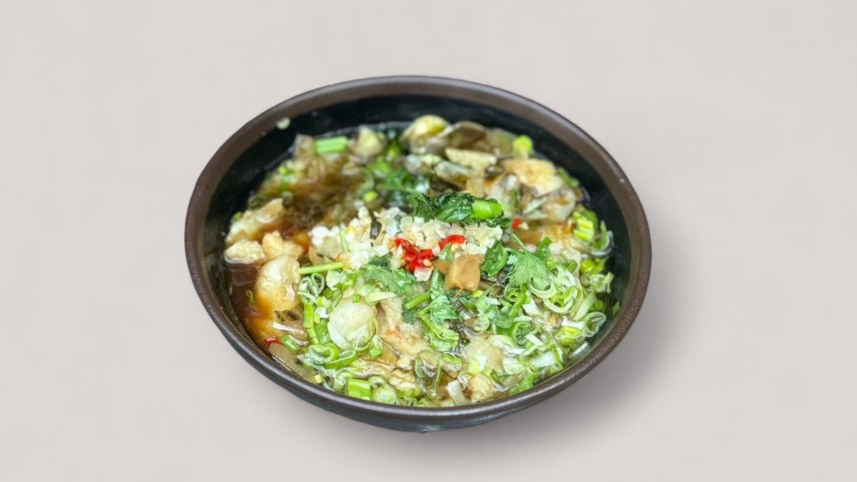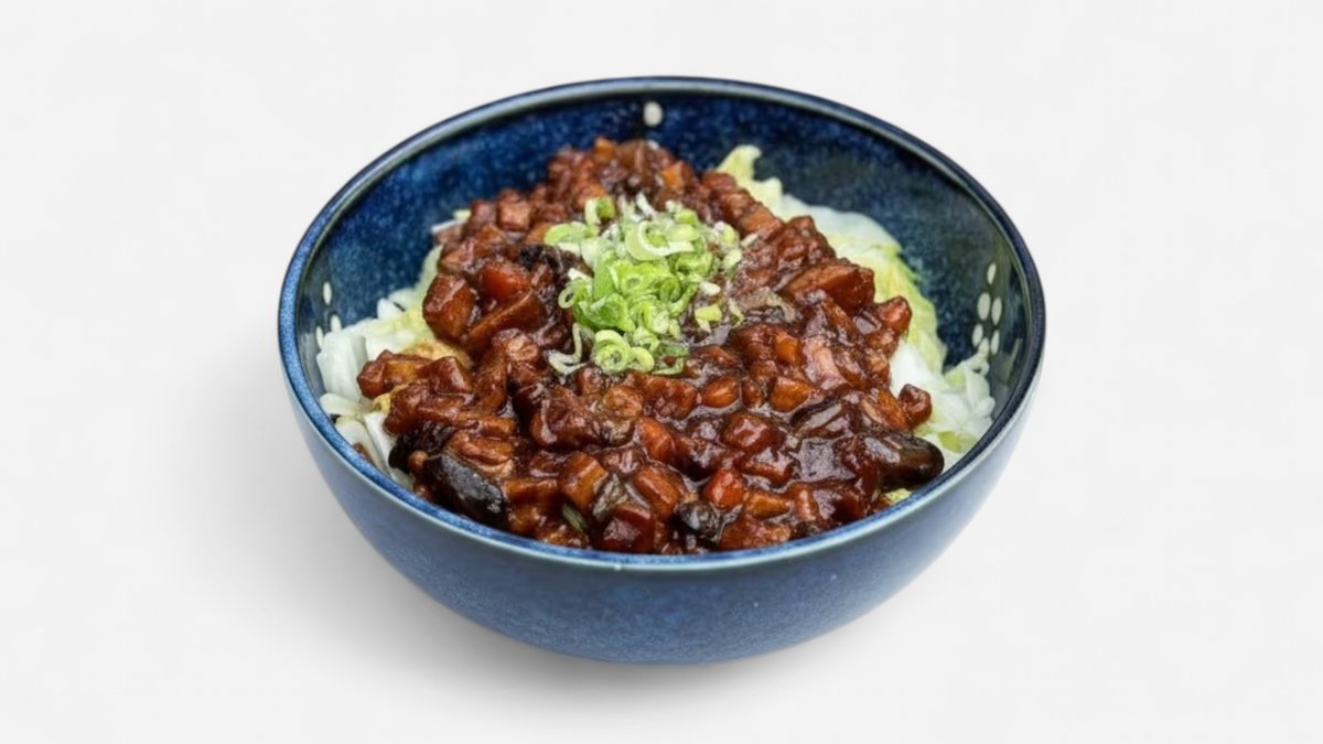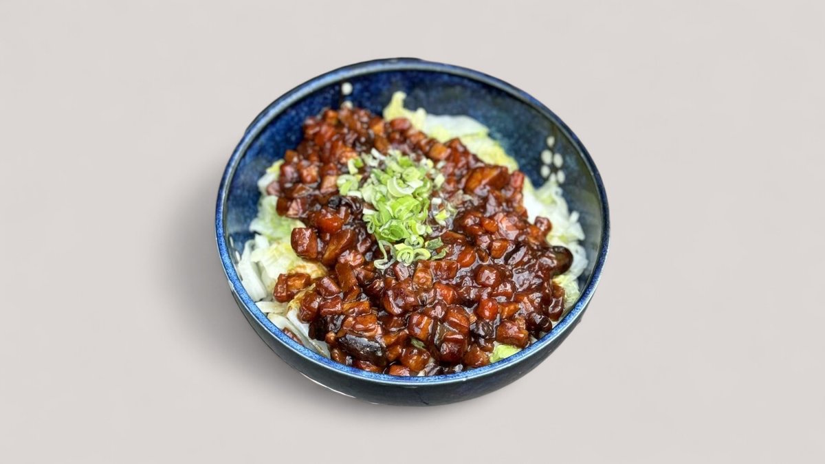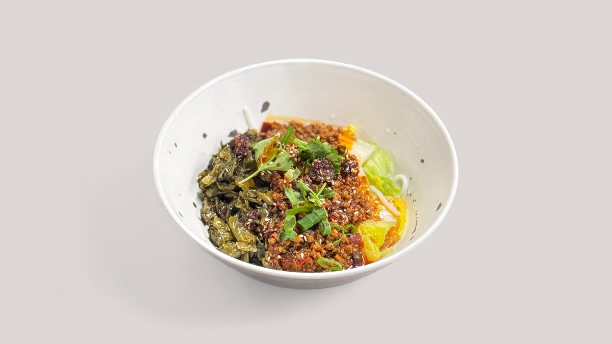 mit gebratenem Schweinehackfleisch, eingelegtem Gemüse und Chiliöl
