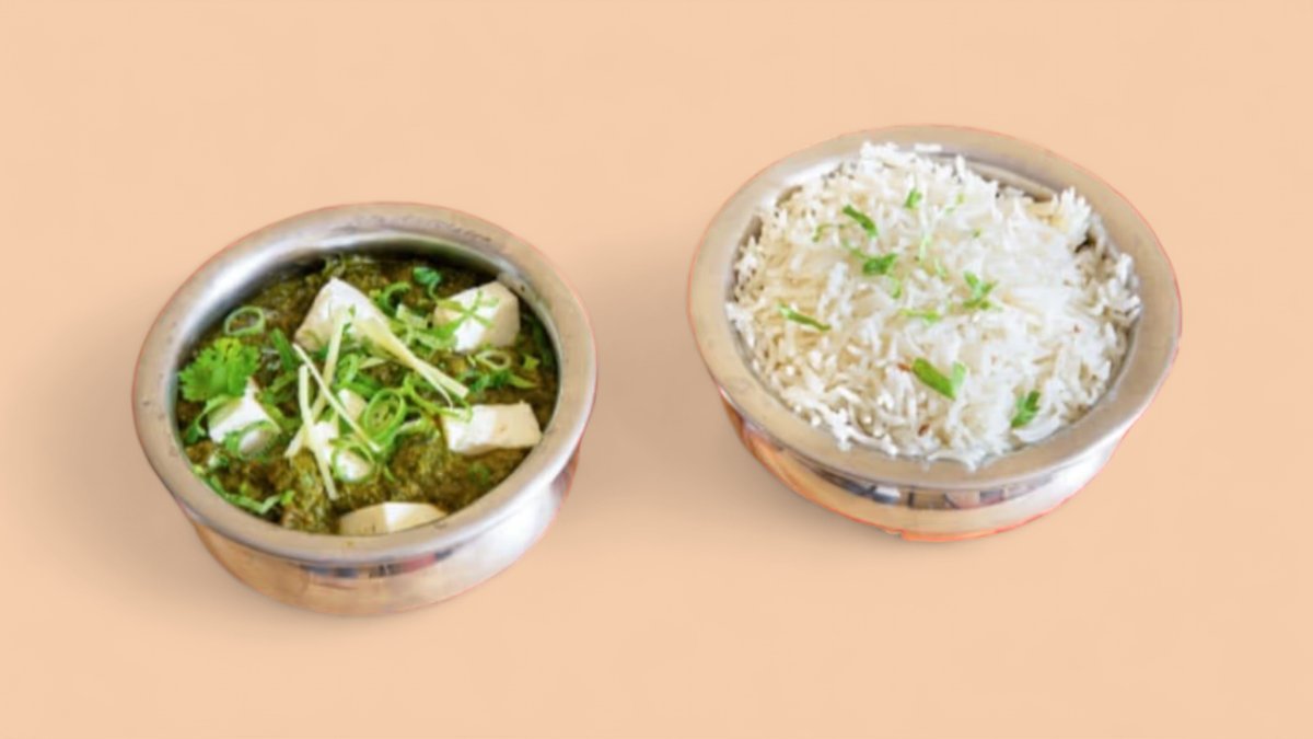 mit Spinat und Sojafleisch in Kokosmilch-Currysoße Das Gericht kann Spuren von Nüssen enthalten.