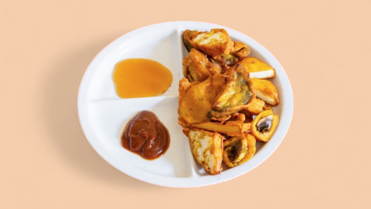 Hähnchen, Kartoffeln, Auberginen, Blumenkohl, Paneer in Kichererbsenteig gebacken
