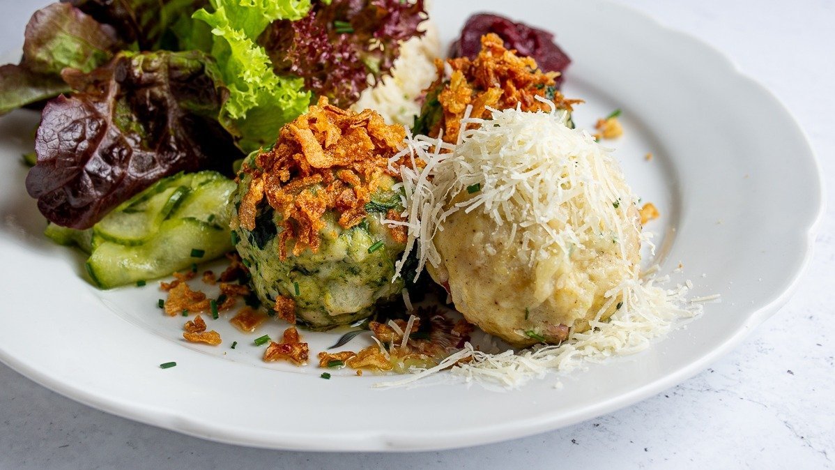 Knödel nach Wahl mit Parmesan, Butter & gemischtem Salat