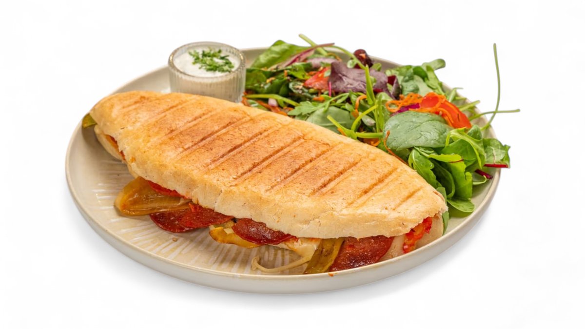 Brot mit Sucuk vom Rind, Ajvar, Tomatenmark und Gouda, serviert mit Salat