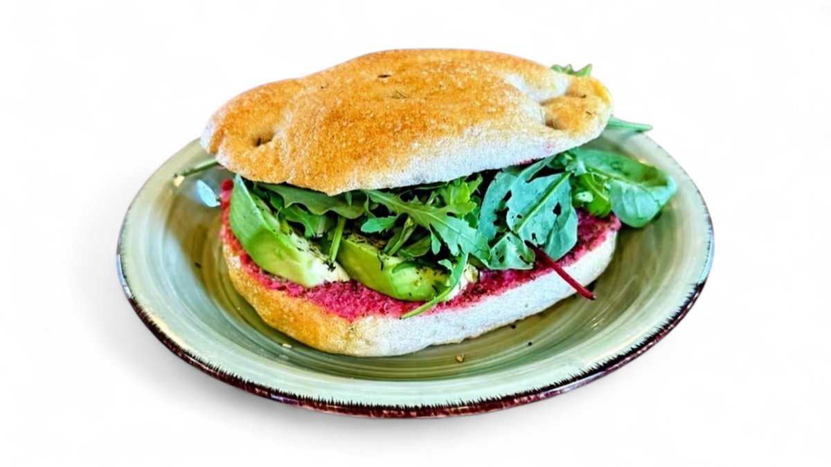 Egg Drop Veganer Sucuk Sandwich, mit Salat und Hummus serviert, Halal