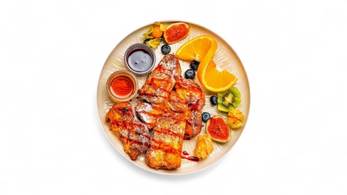 Briochebrot mit Eiern, Obst und Maulbeersirup