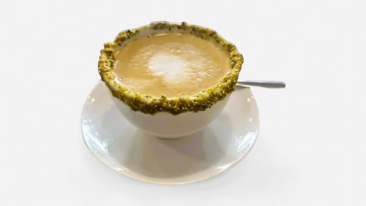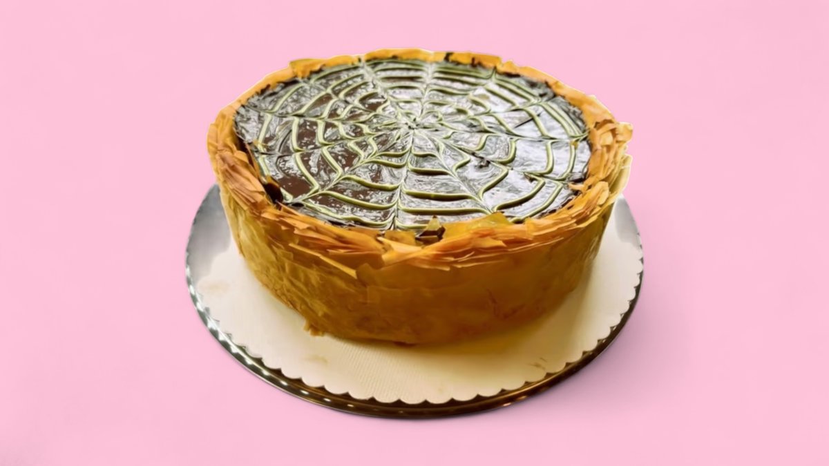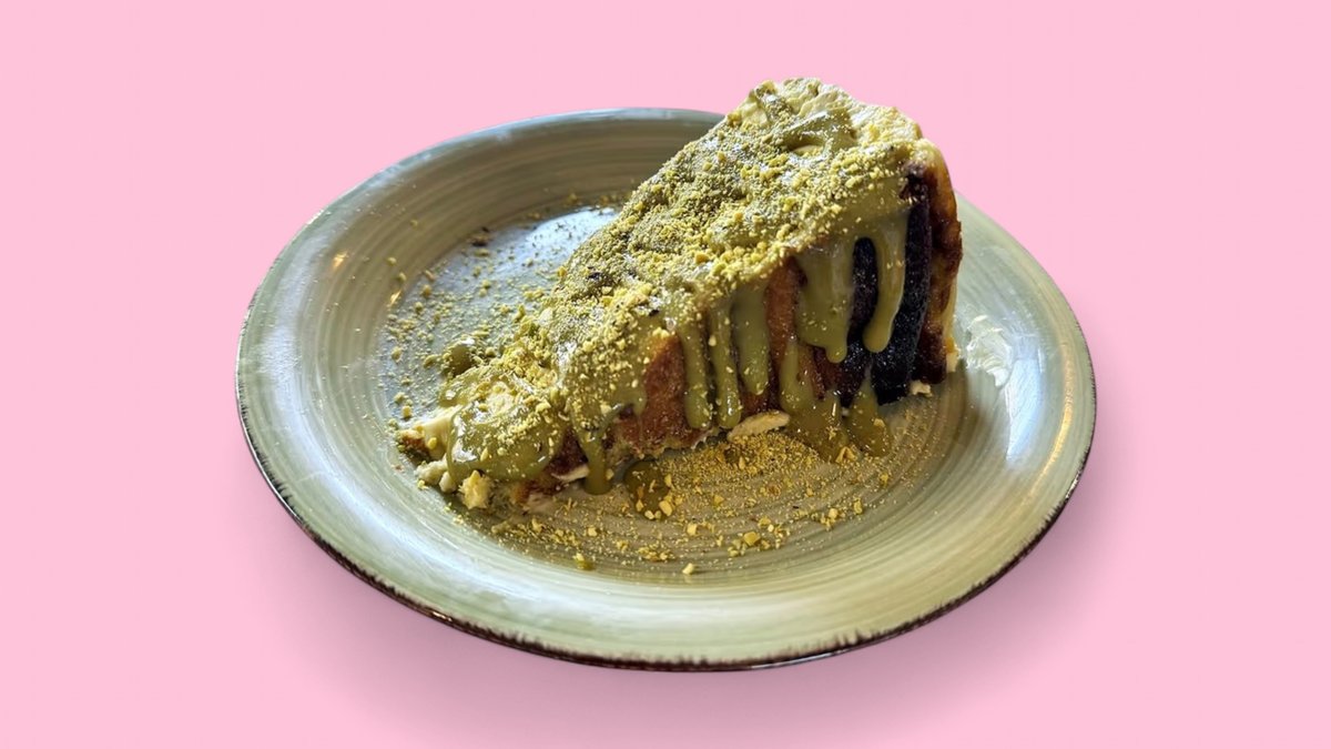 Hausgemachter San Sebastian Pistacchio Cheesecake, serviert mit Pistaziensoße und Pistazientopping