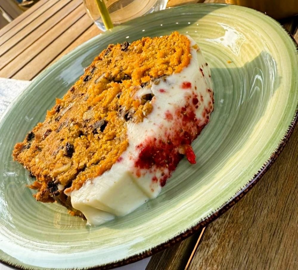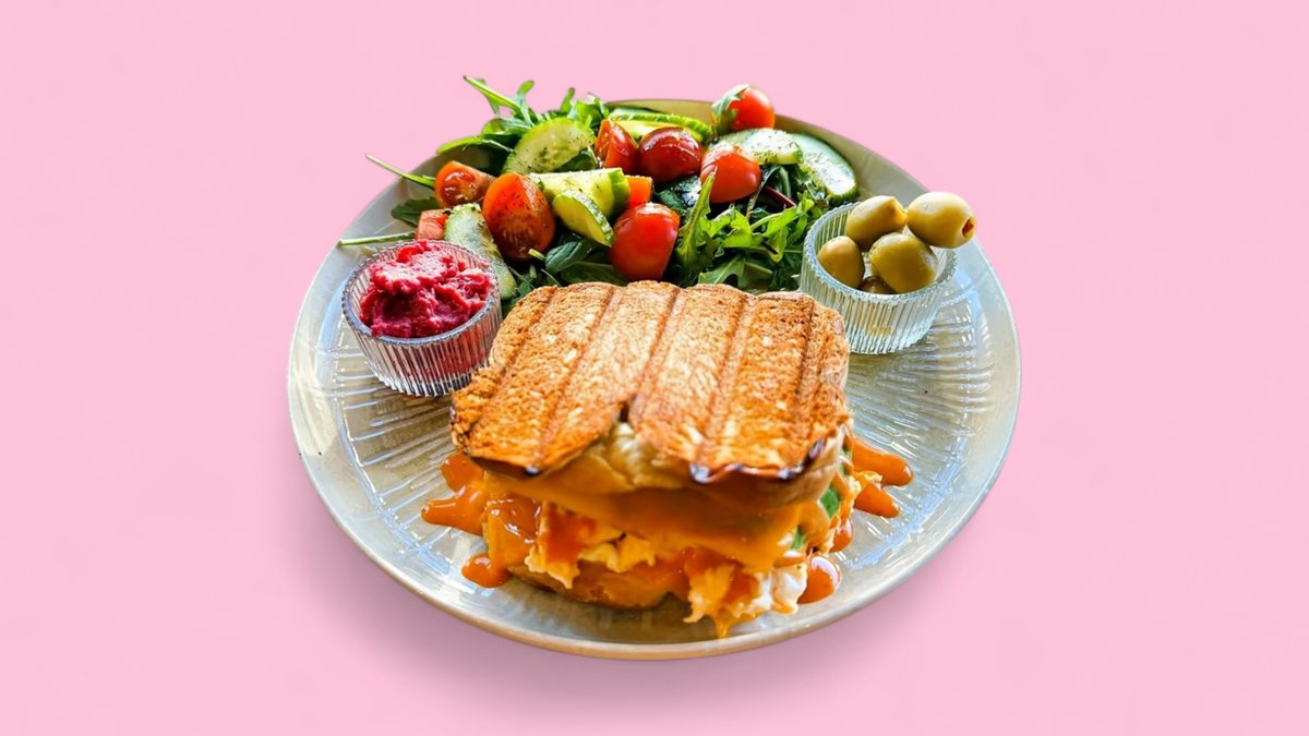 Hausgemachtes Egg Drop Veganer Sucuk Sandwich mit Cheddar und hausgemachter Chilisoße, mit Salat und Hummus serviert