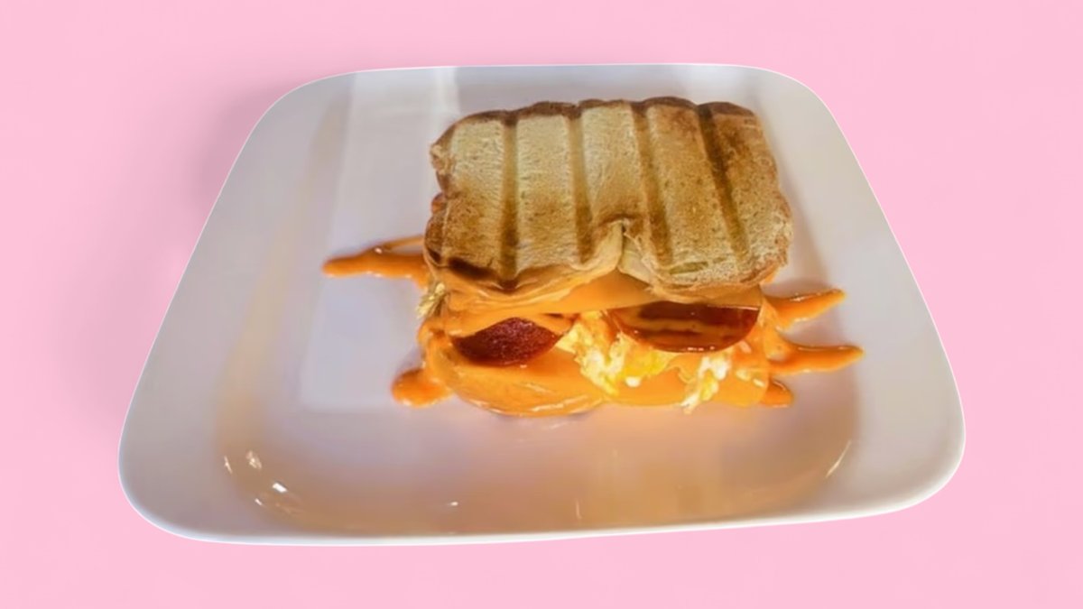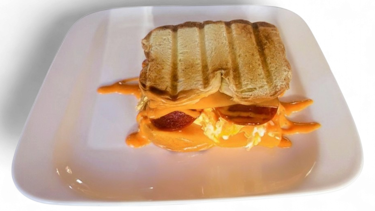 Hausgemachtes Egg Drop Sucuk Sandwich mit Cheddar und hausgemachter Chilisoße