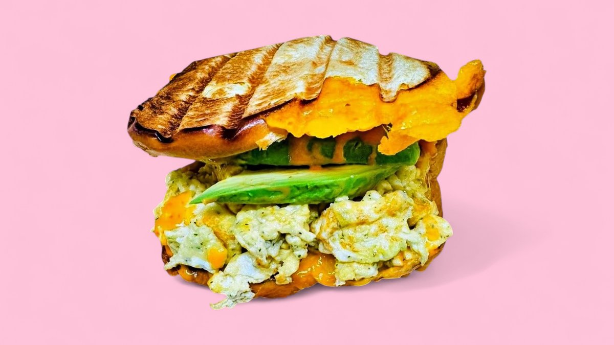Hausgemachtes Egg Drop Sandwich mit Cheddar, Avokado und hausgemachter Chilisoße