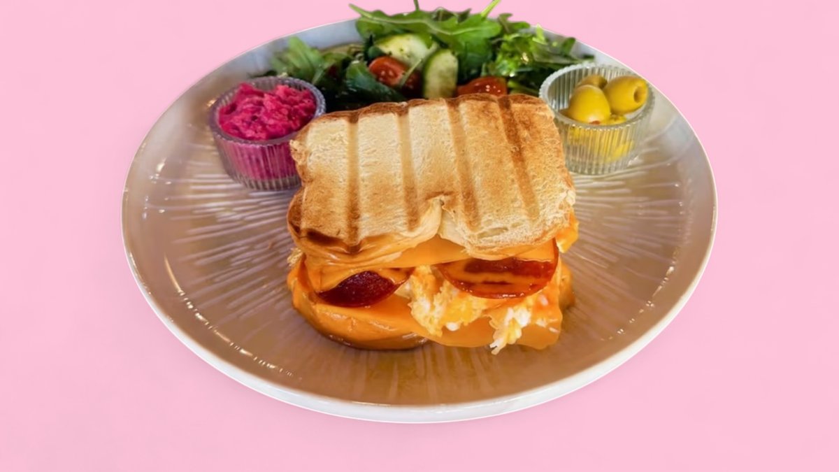 Hausgemachtes Egg Drop Pastirma Sandwich mit Cheddar und hausgemachter Chilisoße, mit Salat und Hummus serviert
