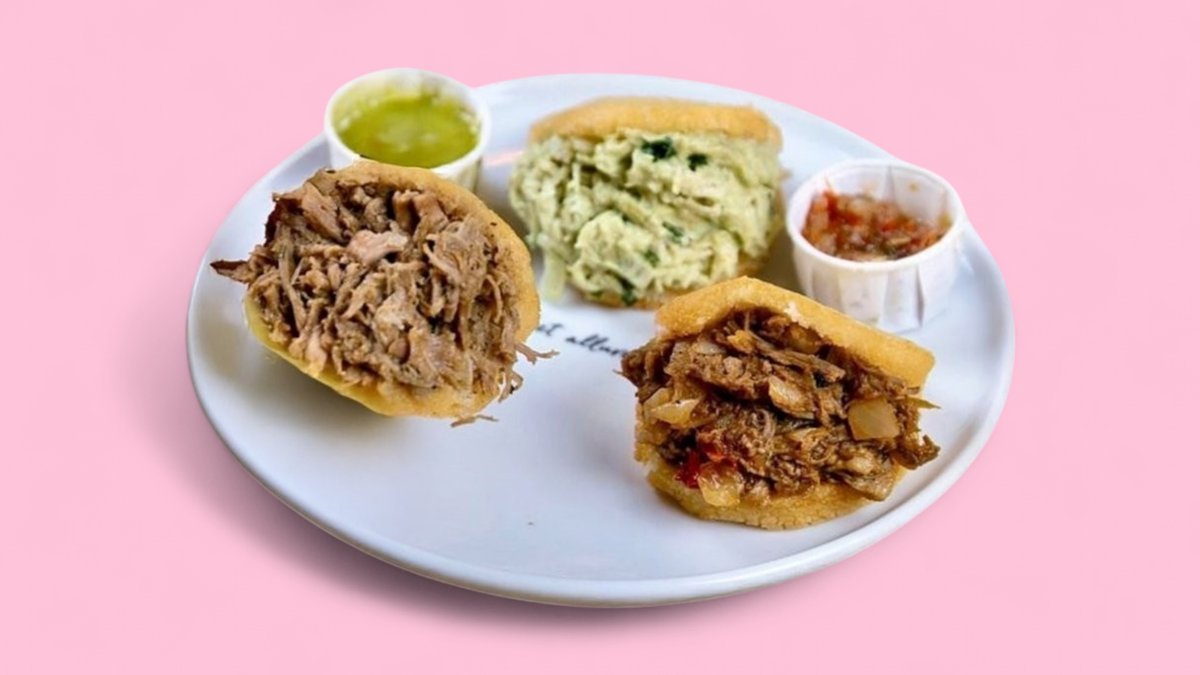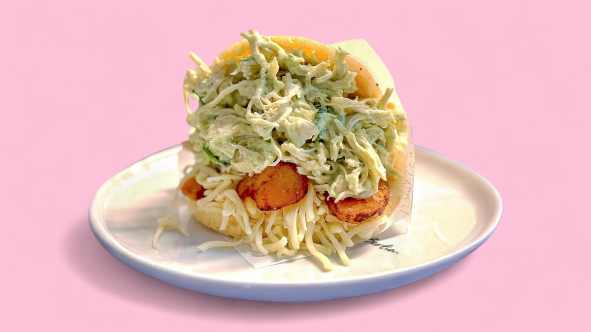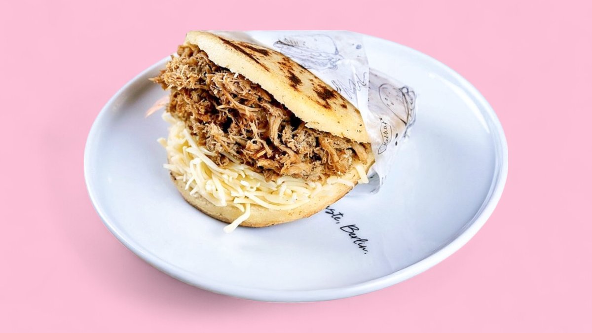 Langsam gegartes, zartes Schweinefleisch mit geriebenem Käse in einer goldbraunen Arepa. Slow-cooked tender pulled pork with grated cheese in a golden arepa.