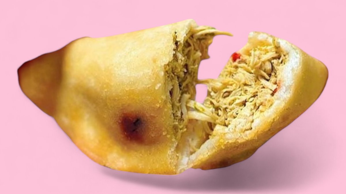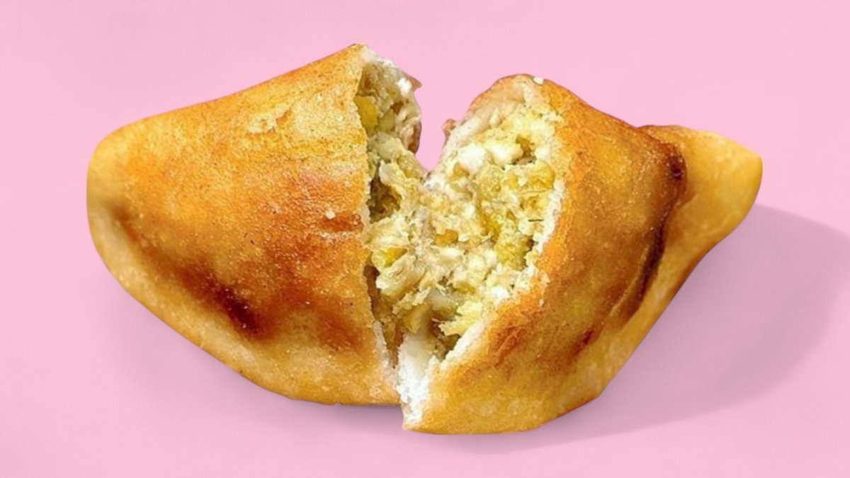 Zarte Hähnchenfüllung in einer goldbraun frittierten Maisempanada – ein Klassiker. Tender chicken filling in a golden-fried corn empanada – a true classic.
