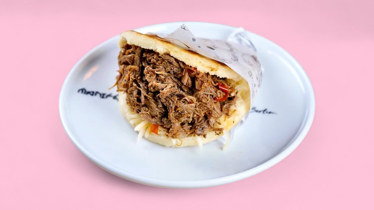Arepa gefüllt mit venezolanischem Rindfleisch (200 g) und geschmolzenem Käse. Arepa filled with Venezuelan-style shredded beef (200g) and melted cheese.