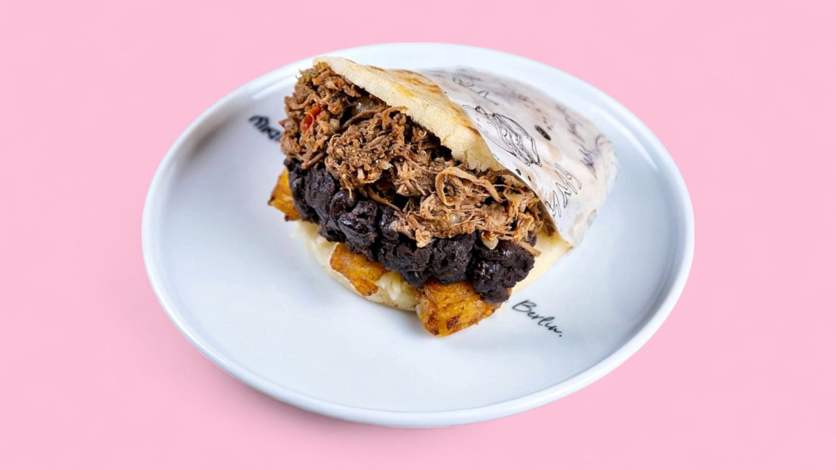 Unsere beliebteste Arepa: Rindfleisch, frittierte Kochbanane, schwarze Bohnen und Käse. Our most popular arepa: shredded beef, fried plantain, black beans and cheese.