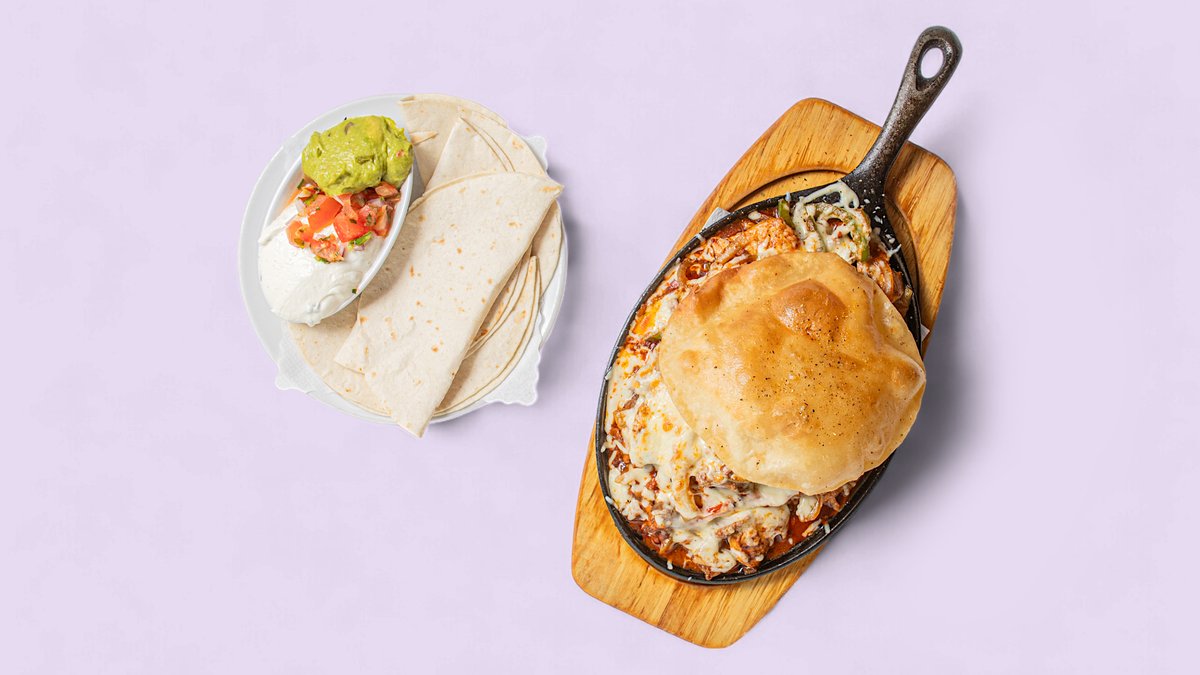gebratene RinderhĂĽftsteakstreifen mit geschmorten Zwiebeln, 4 Weizenmehl-Tortillas, Tomaten, Paprika, Champignons und 3 verschiedenen SoĂźen