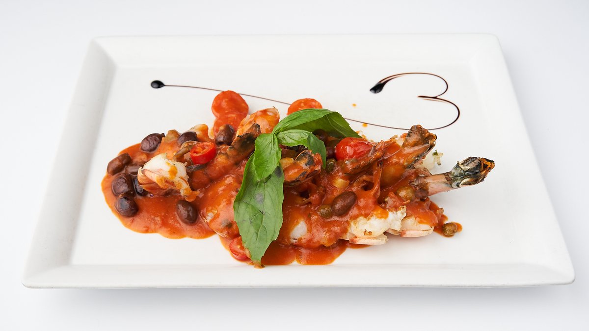 Scampi zubereitet mit Tomaten, Oliven, Kapern, Kräutern auf sizilianische Weise