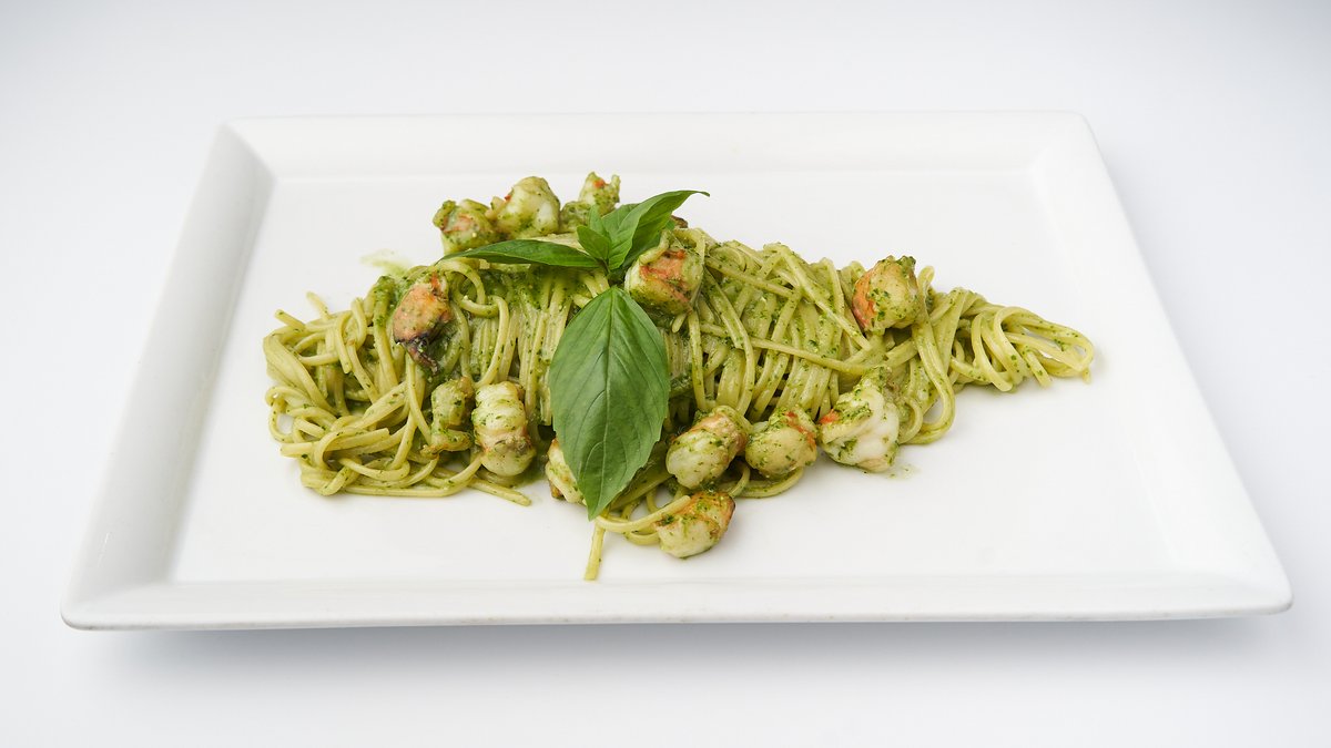 feine lange Nudeln mit aromatischem Pesto und saftigen Scampi