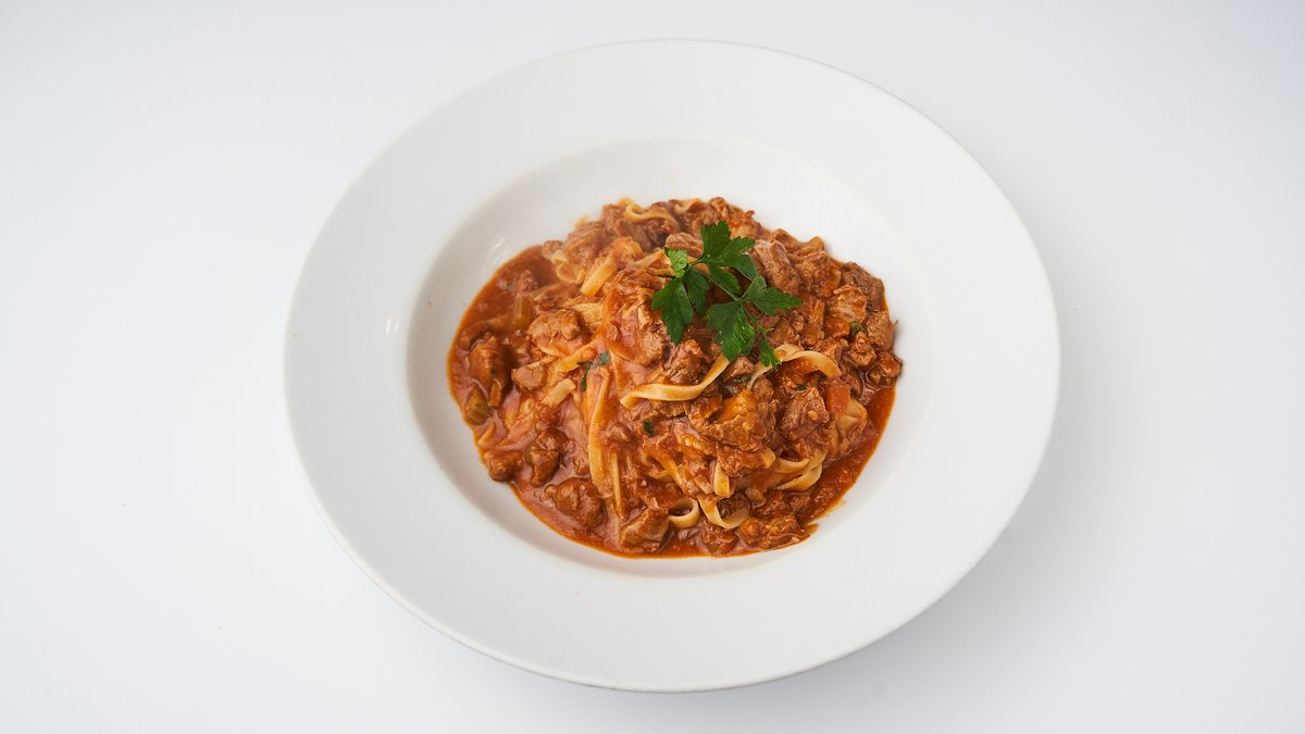 breite Nudeln serviert mit einem zarten Ragout vom Kalb